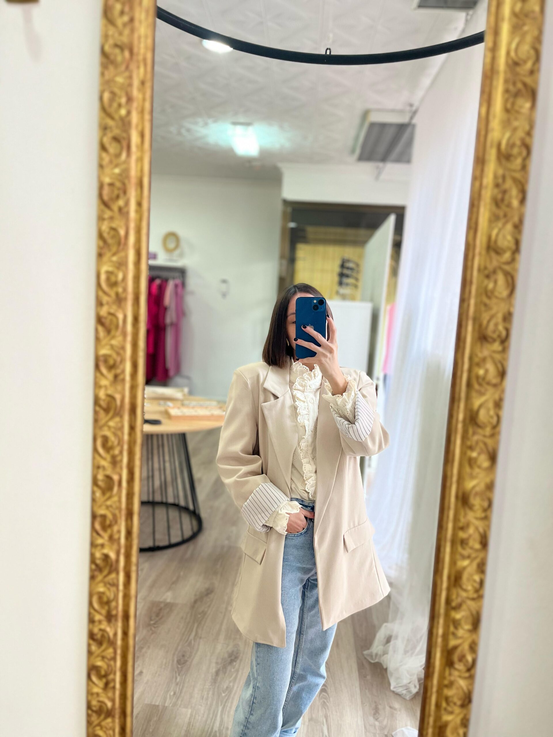 Blazer confeccionada en sarga beige. Abierta, sin botones. Forrada. Talla única.