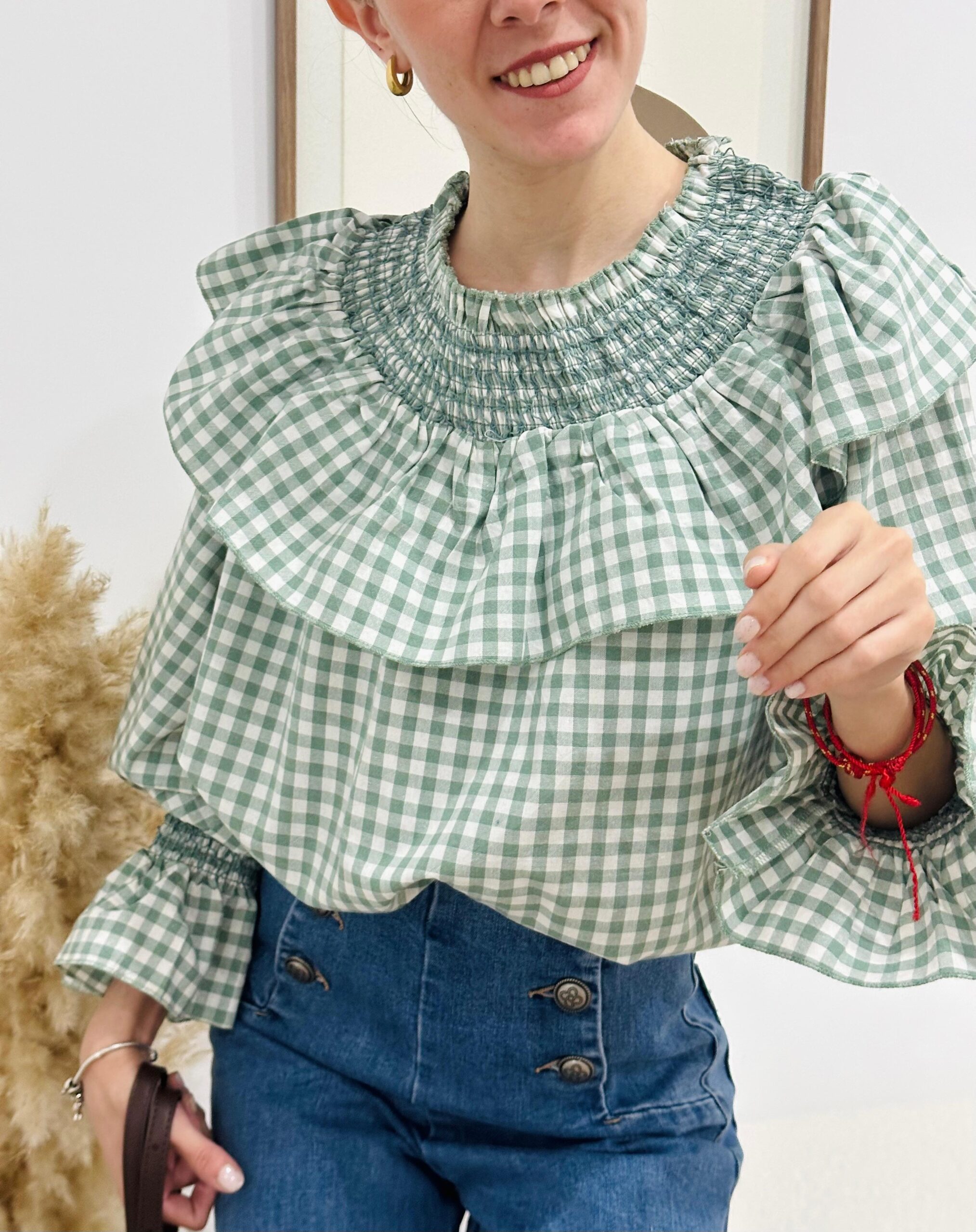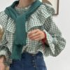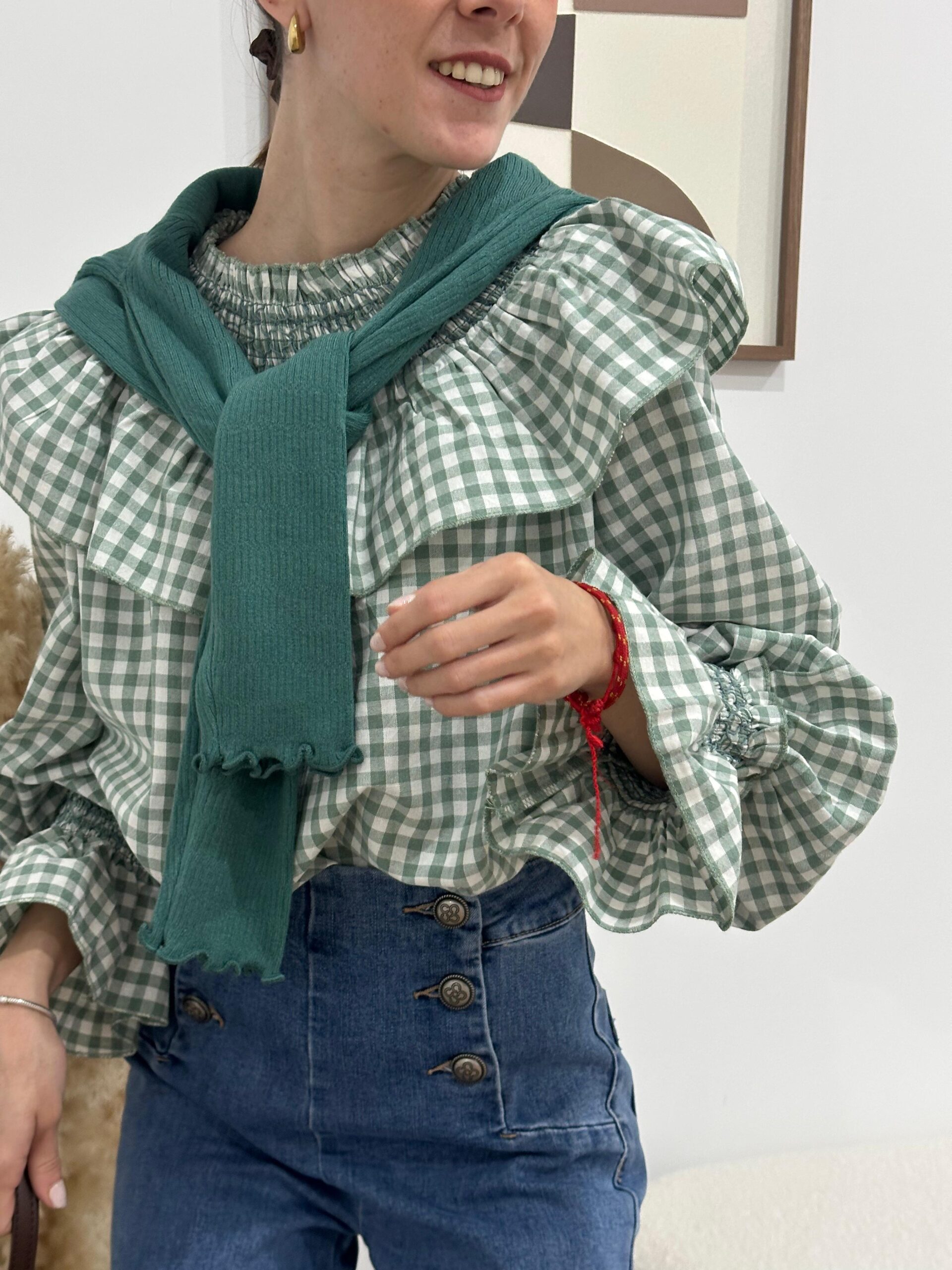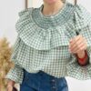 Blusa de cuadros en color verde, con cuello nido de abeja y volante grande. Volante en puños. Corte ancho y recto.