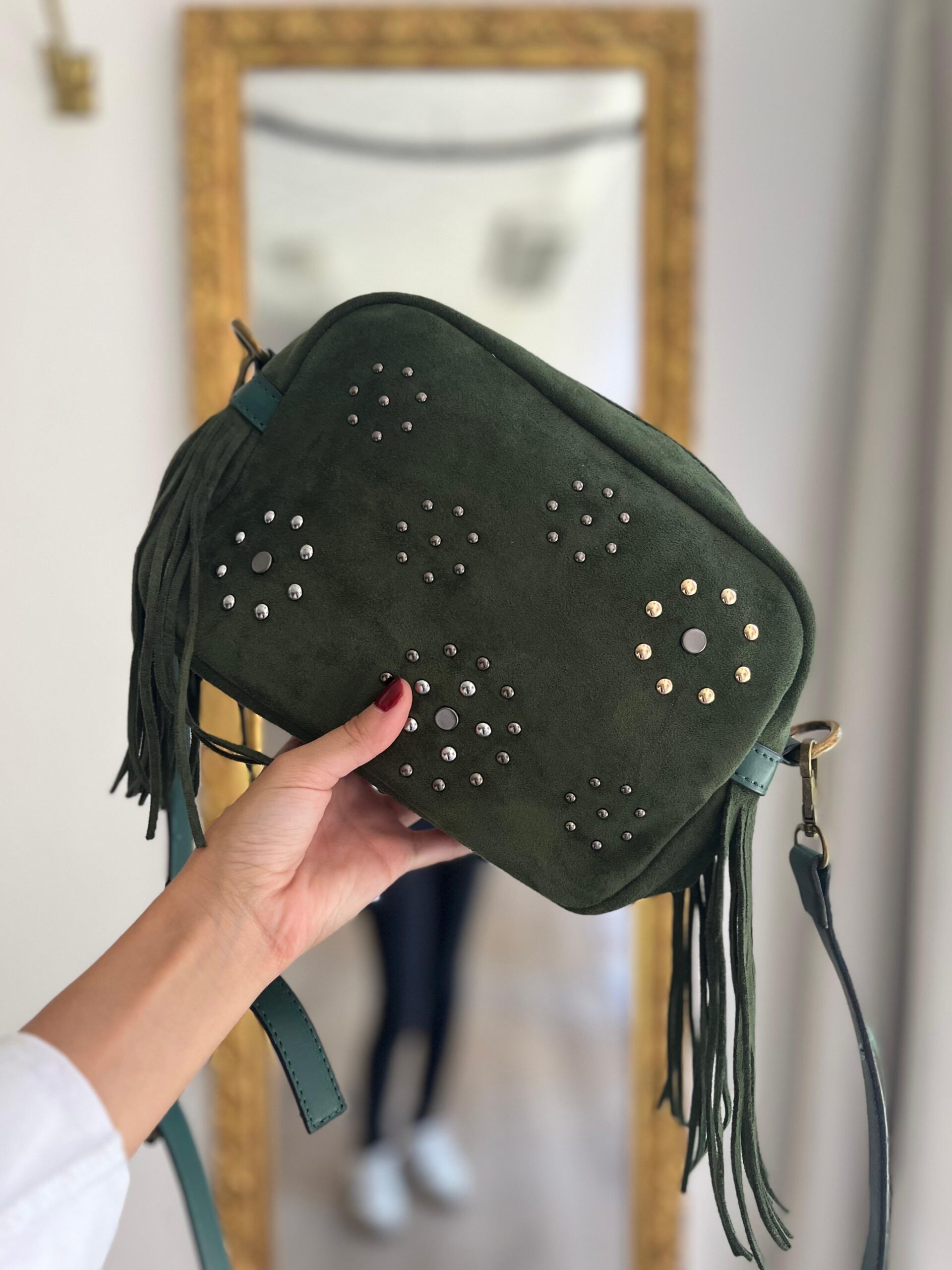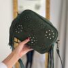 Bolso bandolera en ante color verde botella. Tamaño mediano, con mucha capacidad. Correa ajustable.