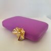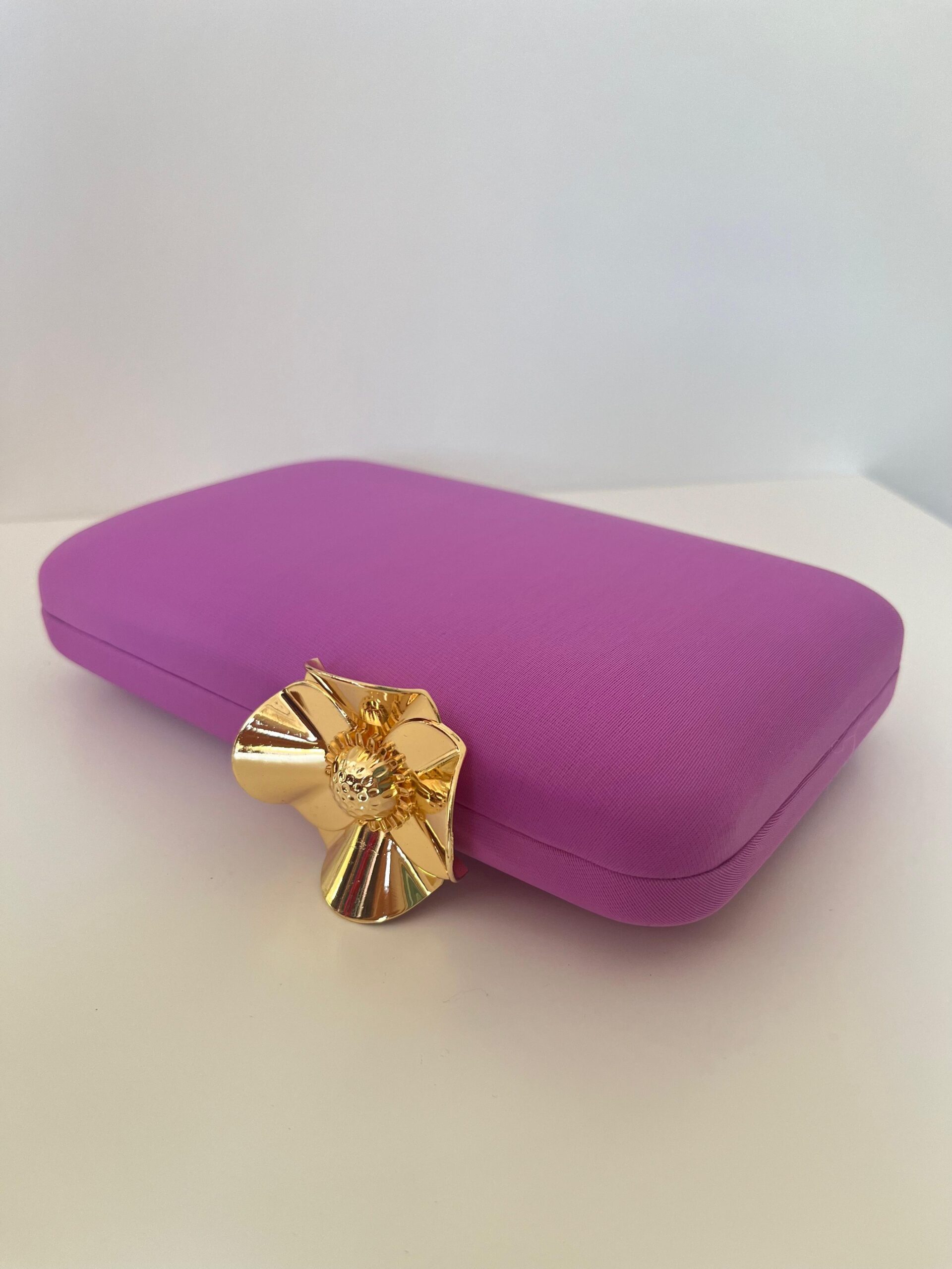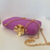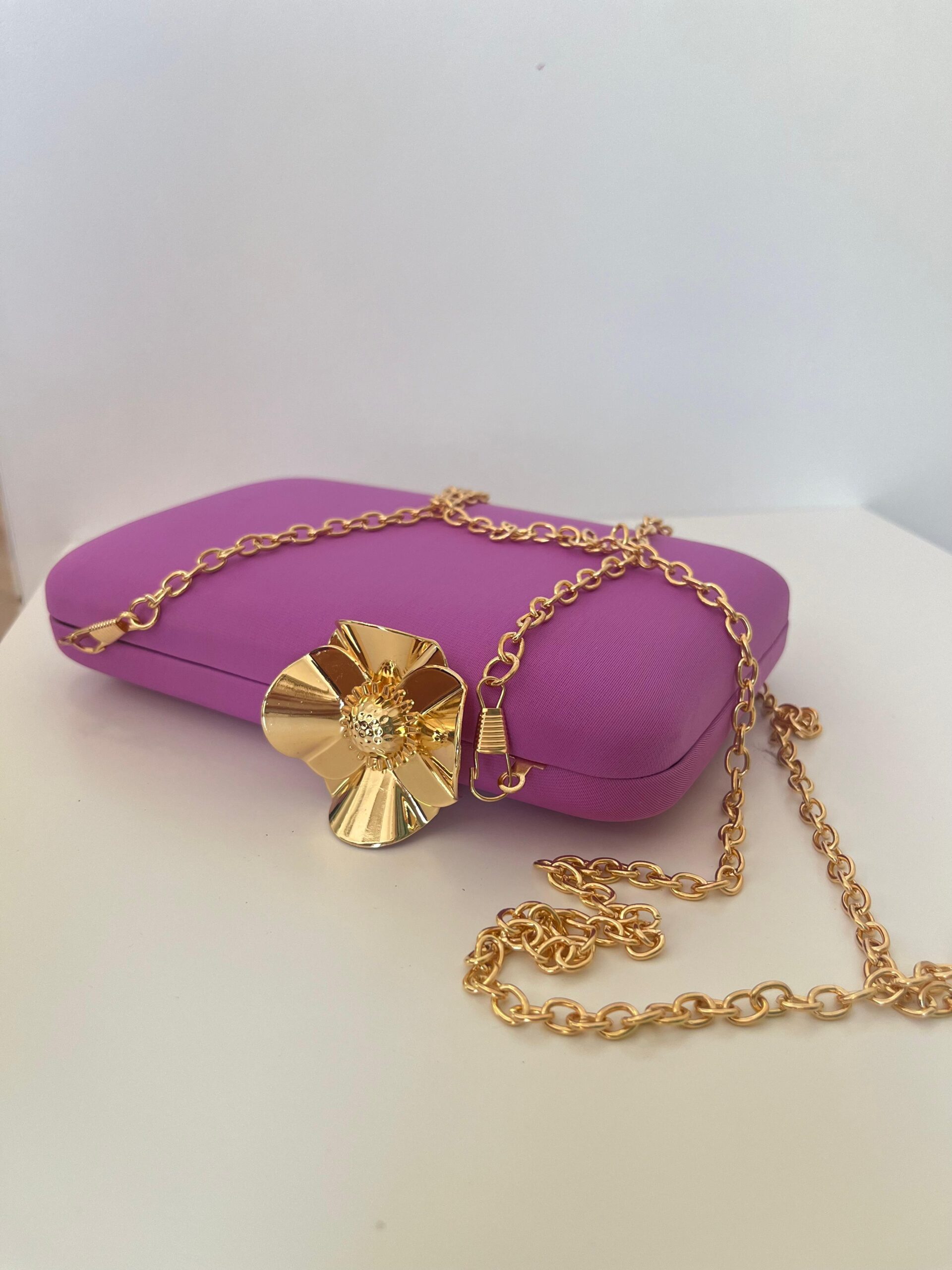 Bolso de invitada liso color malva, con cierre a modo de flor en dorado. Ambos lados iguales. Incluye cadena. Capacidad para teléfono móvil.