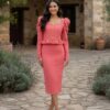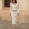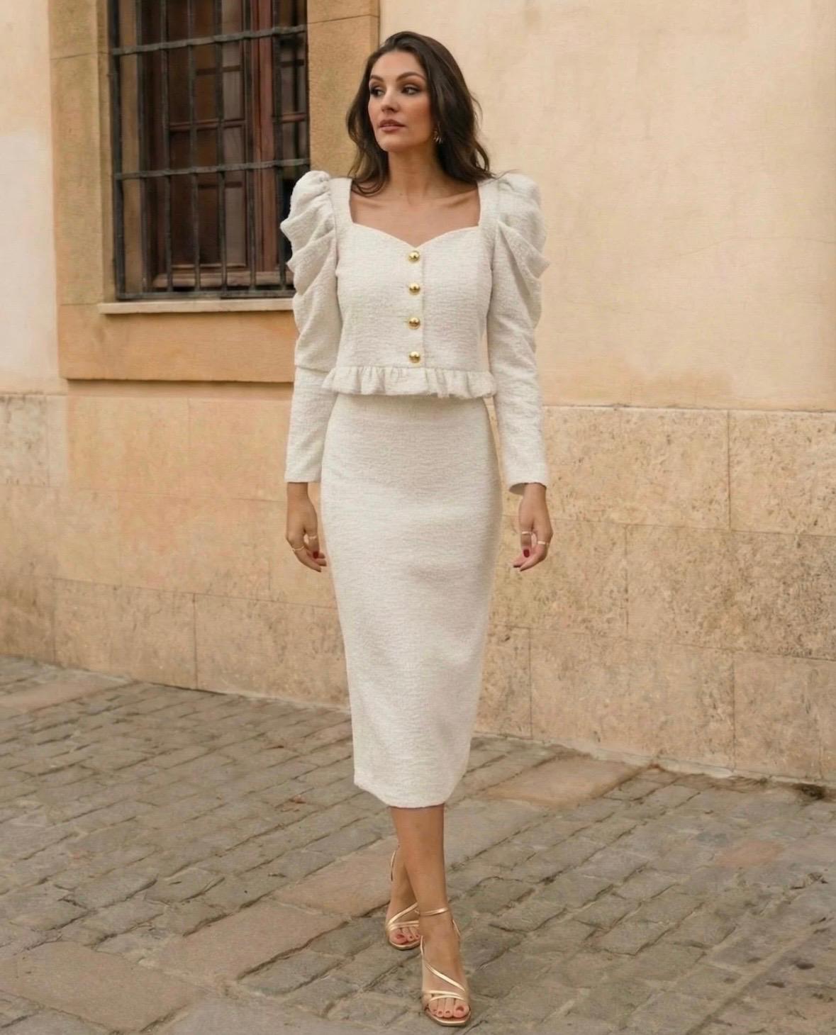 Conjunto dos piezas, de top y falda confeccionado en tweed. Top hasta la cintura, con volantito y manga abullonada. Falda recta. Calidad española. Disponible en dos colores.