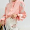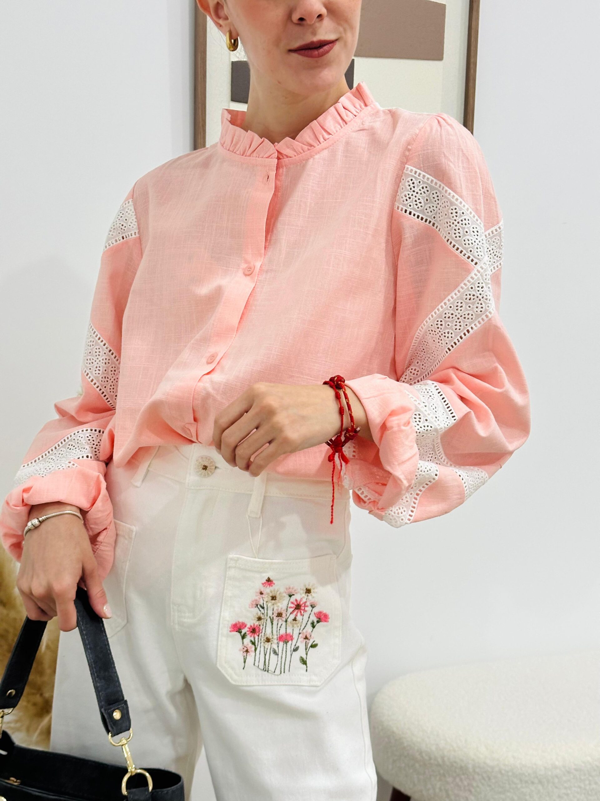 Jean blanco wide-leg, con bolsillos delanteros bordados, en tonos rosas y marrones.