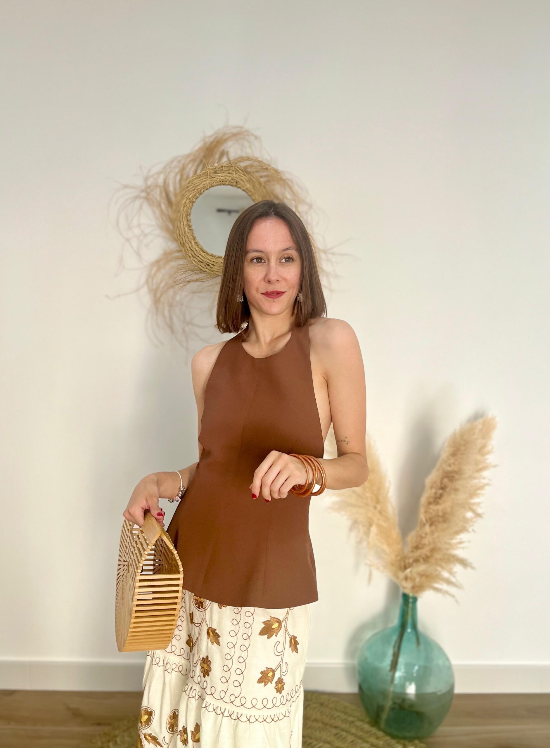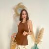 Top en crepe chocolate, con cuello halter abrochado con dos botones. Espalda abierta. Cremallera lateral.