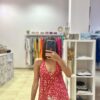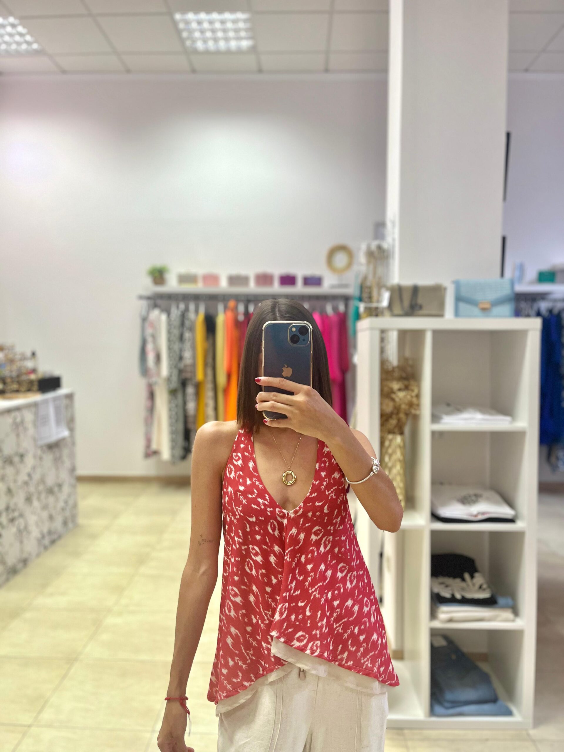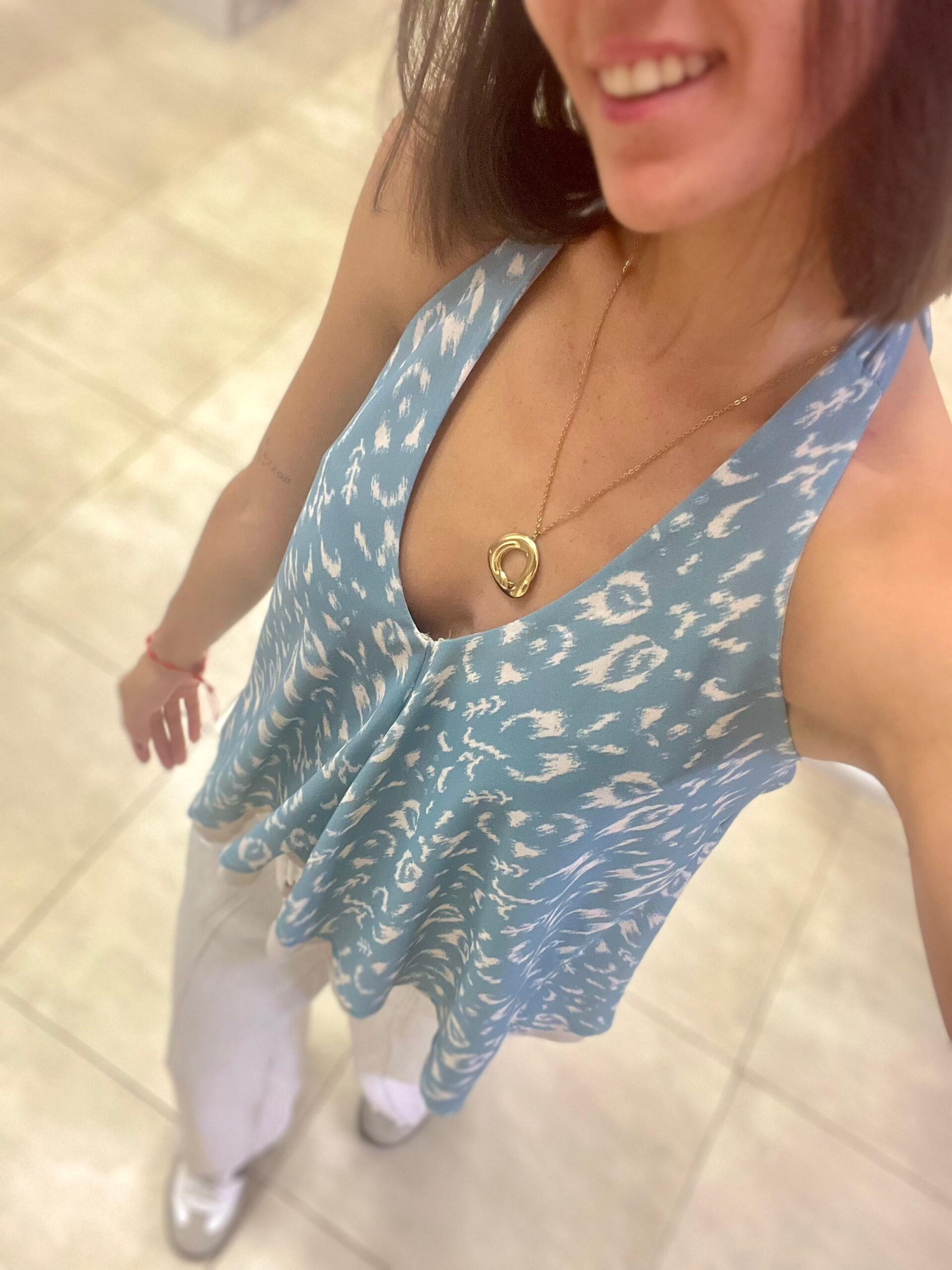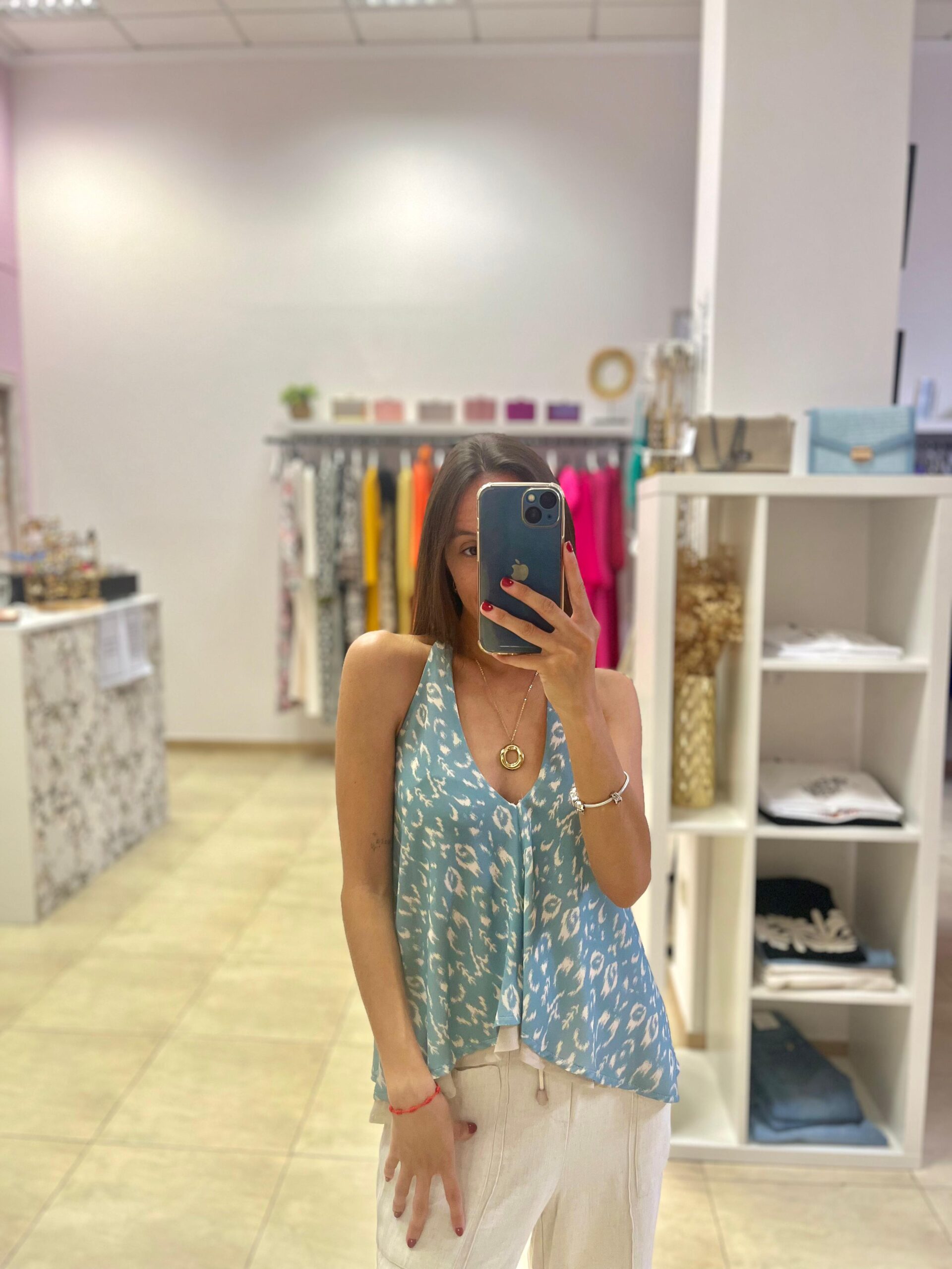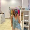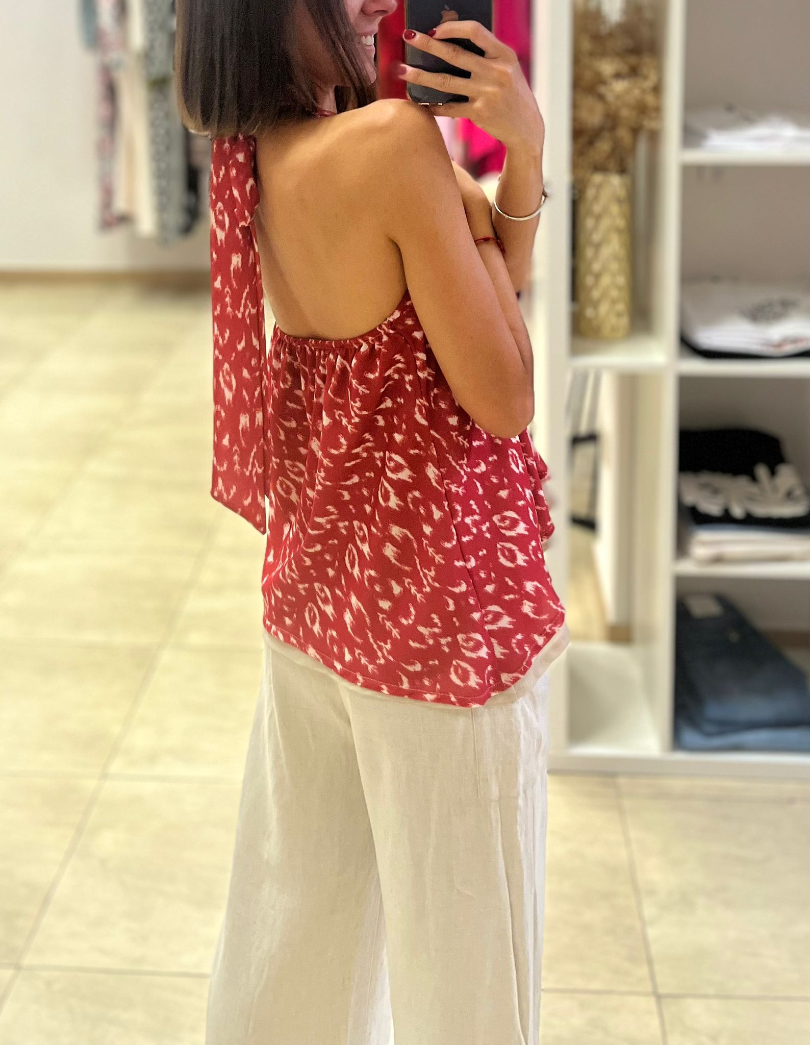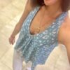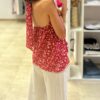 Top de gasa, con forro en gasa también. Atado al cuello con lazada, espalda con goma, queda a la altura del sujetador. Más largo por detrás. Talla única.