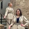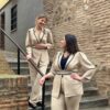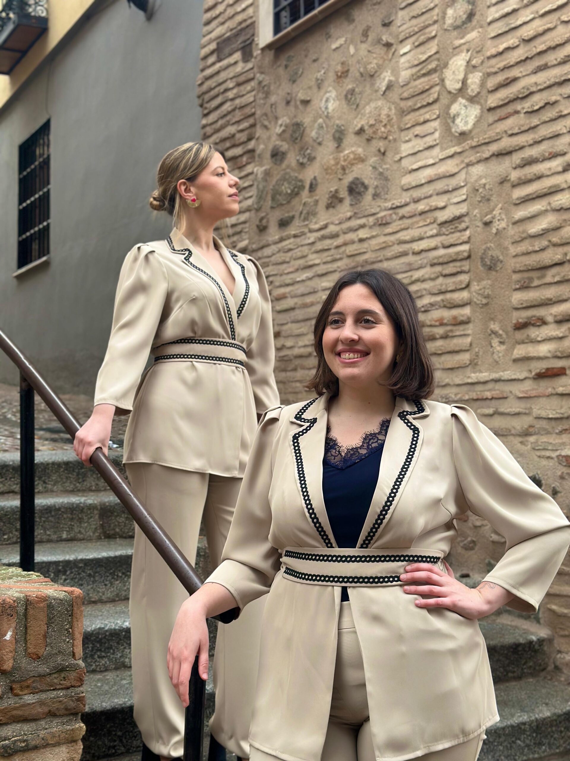 Traje dos piezas. Blazer fluida y pantalón. Confeccionado en crepe muy fluido beige, con detalles en negro. Gran calidad, marca española.