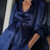 Vestido midi confeccionado en tejido de raso. Abotonado con escote camisero y lazo para ajustar. Manga abullonada con goma para ajustar.