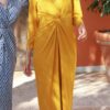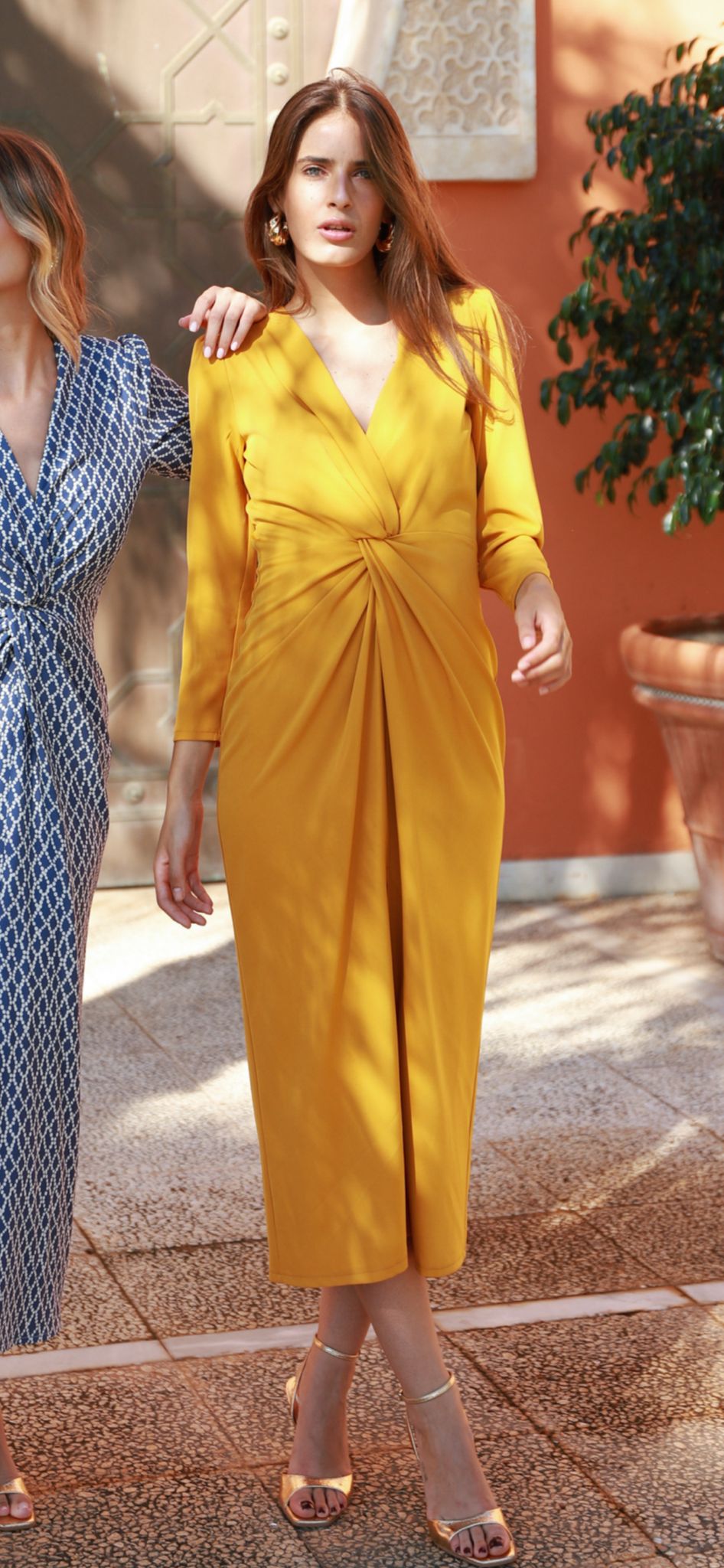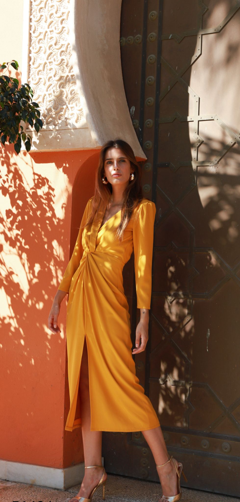 Vestido para invitada confeccionado en crepe mostaza, con manga larga, escote en V y nudo debajo del pecho. Espalda sencilla. Largo midi. Vestido recomendado para invitada de día y para invitada de invierno acompañado de una estola de pelo.