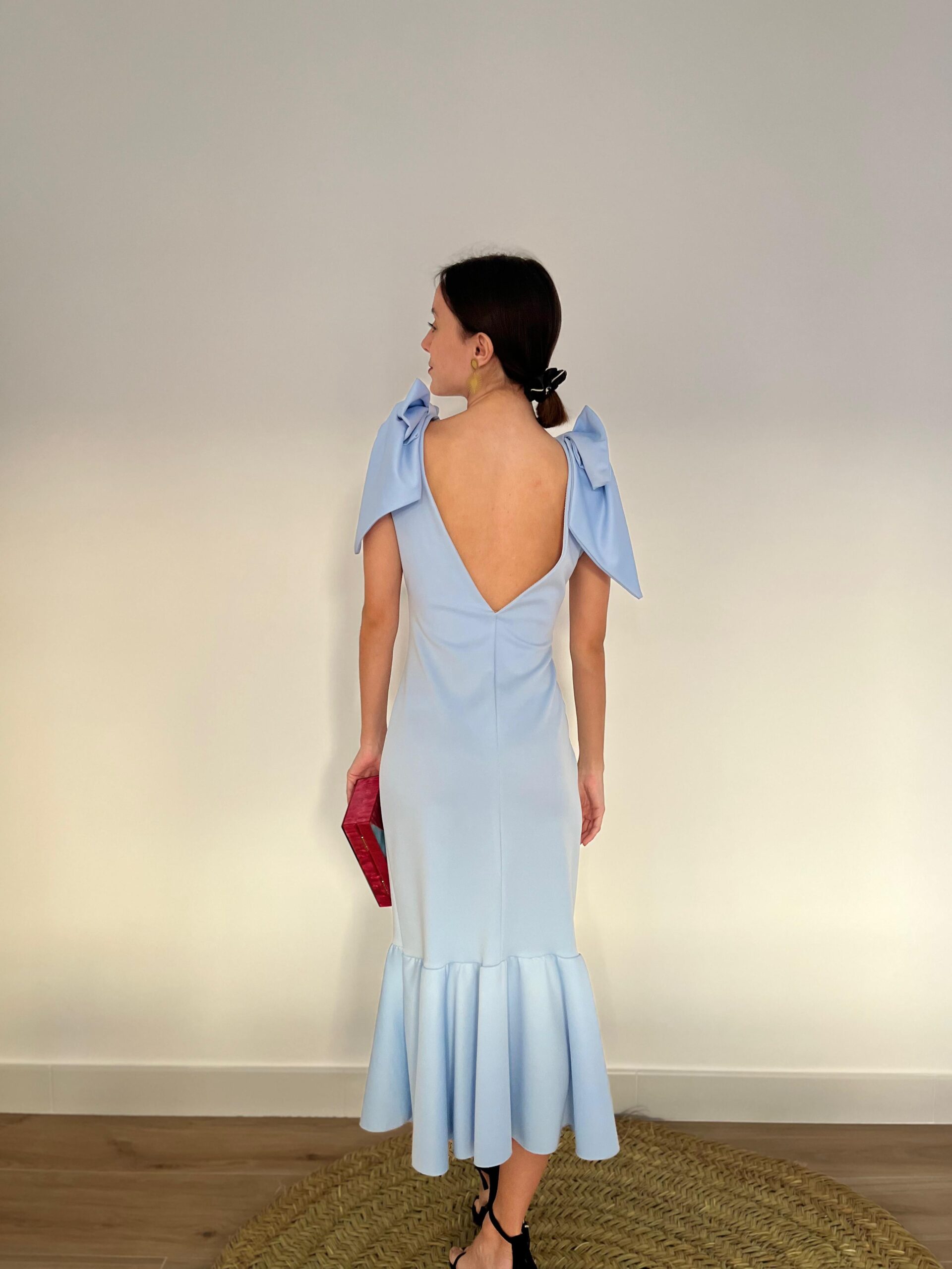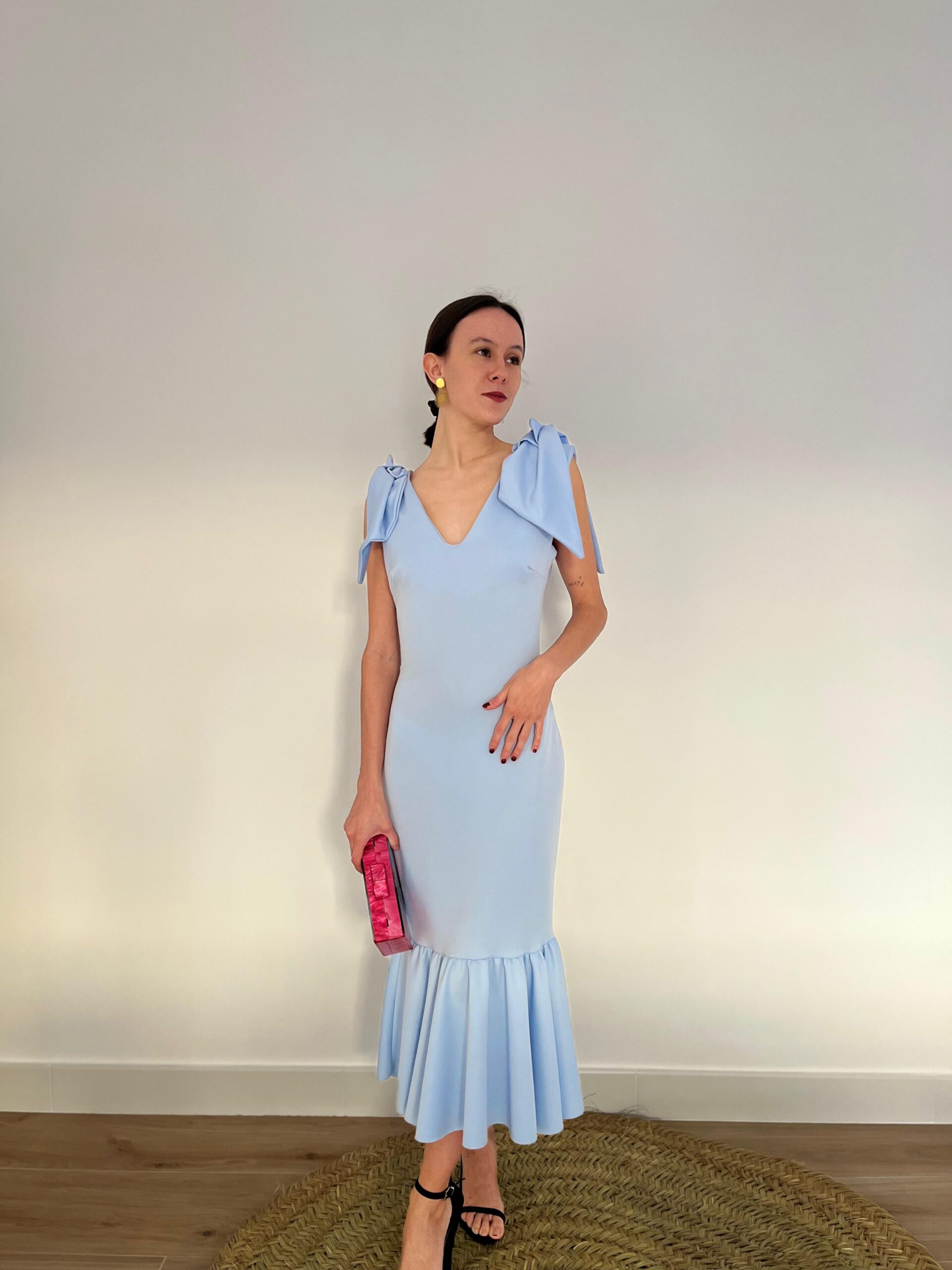 Vestido midi, confeccionado en punto lycra azul bebé. Se entalla a tu cuerpo perfectamente, resaltando tu silueta y dando ese movimiento con su volante en el bajo. Tirantes con dos maxi lazos a modo de decoración. Escote en V tanto delante como en la espalda. Talla única.