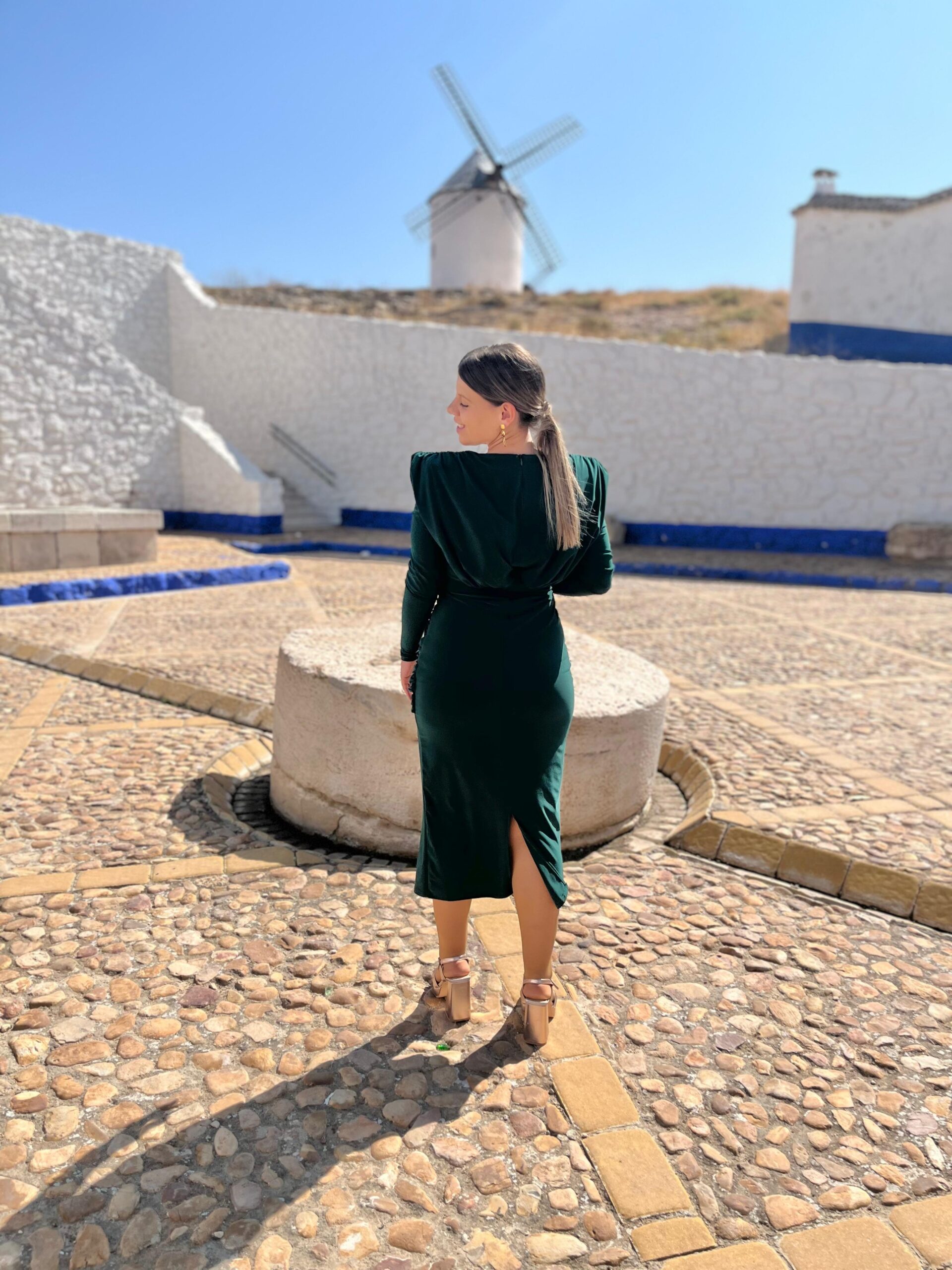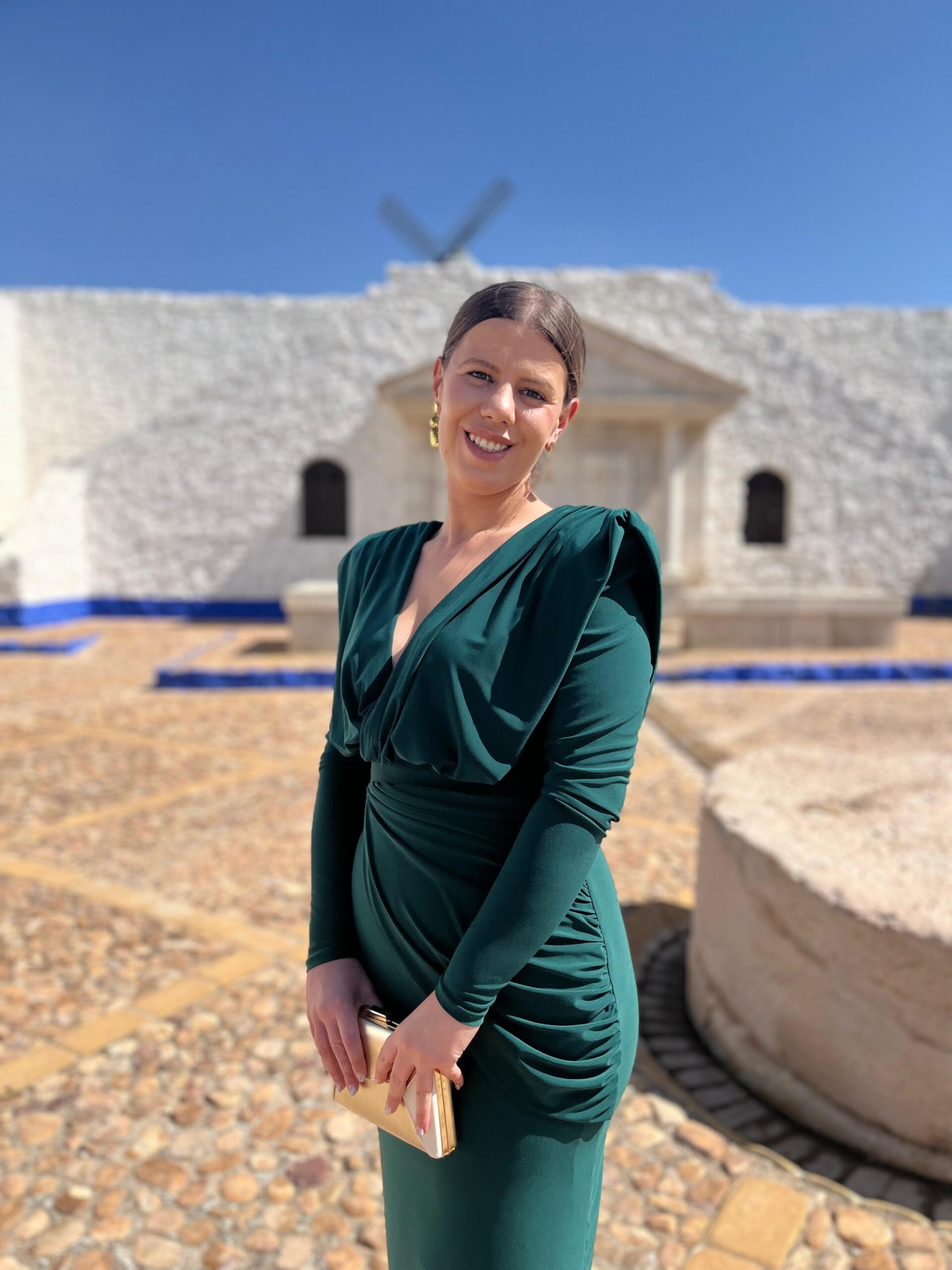 Vestido confeccionado en punto seda color verde botella. Es un modelo que se ciñe perfectamente a tu cuerpo, marcando la silueta. Es de manga larga y largo midi. Todo el cuerpo va fruncido, y en la zona de la tripa también. Escote cruzado. Hombros muy marcados por sus hombreras.