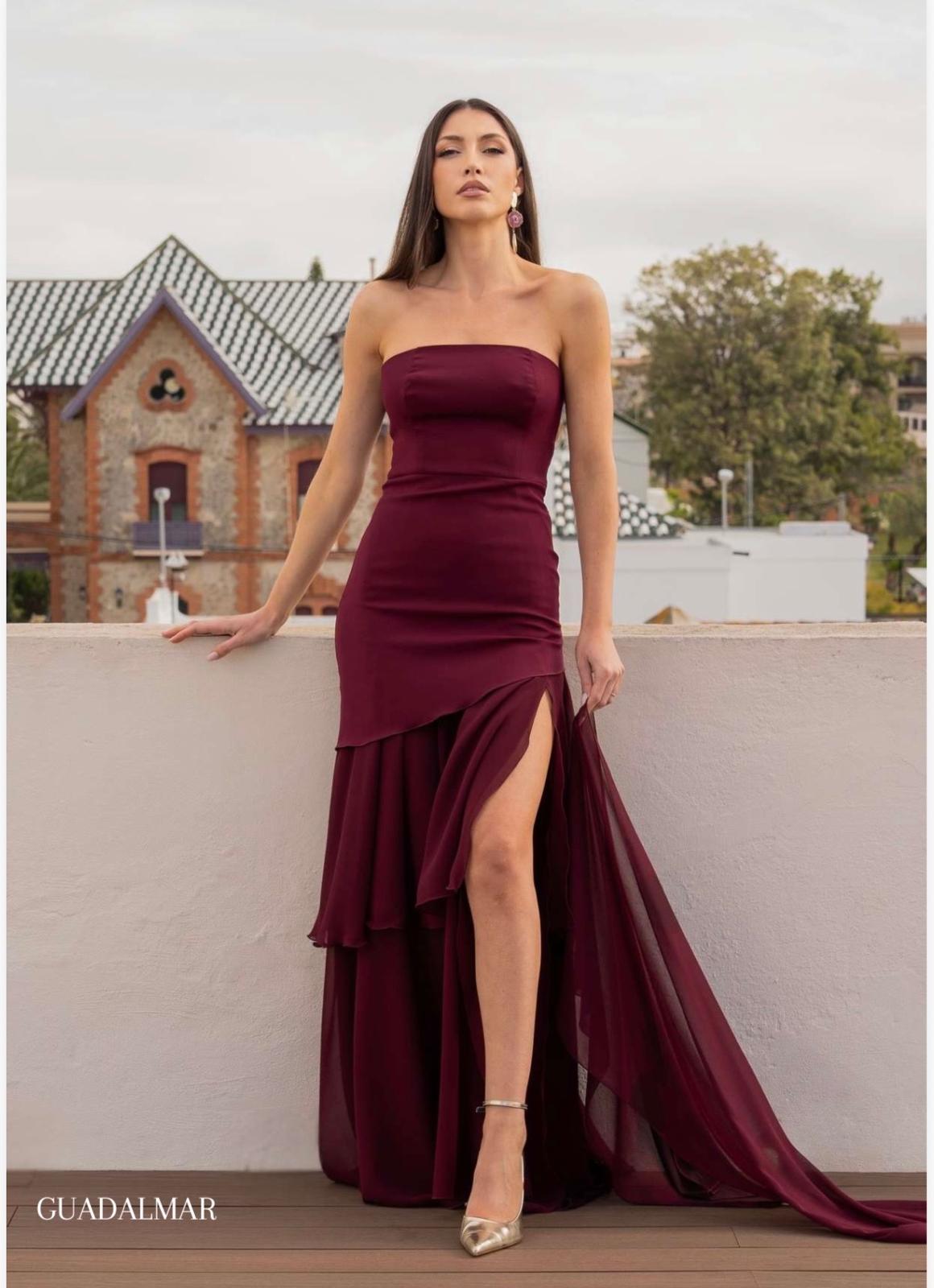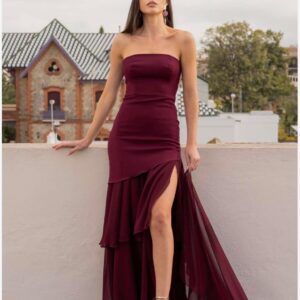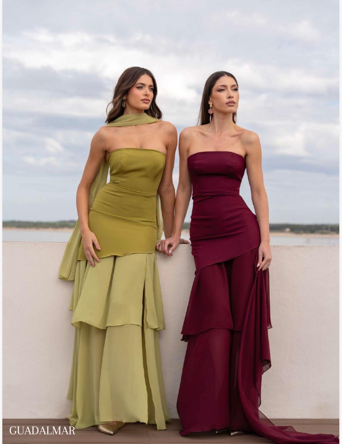Vestido largo de invitada, confeccionado en crepe y gasa. Disponible en dos colores. Palabra de honor, con fular incluido. Marca Mariquita trasquilá, marca española.