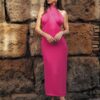 Vestido midi multiposición confeccionado en crepe, combinado con dos grande tiras en gasa para colocar a modo decoración. Cuello halter y espalda totalmente descubierta. Vestido entallado.