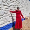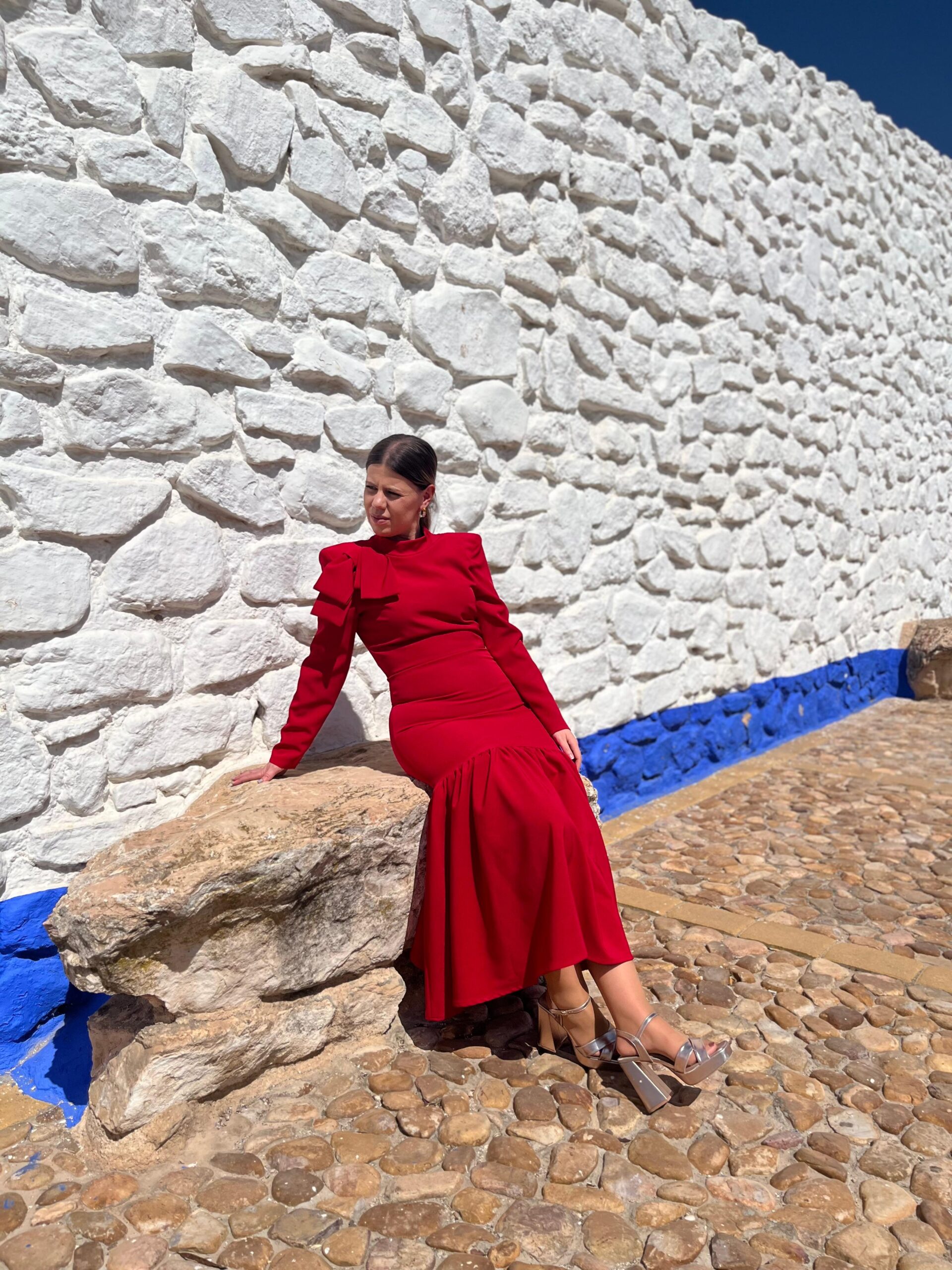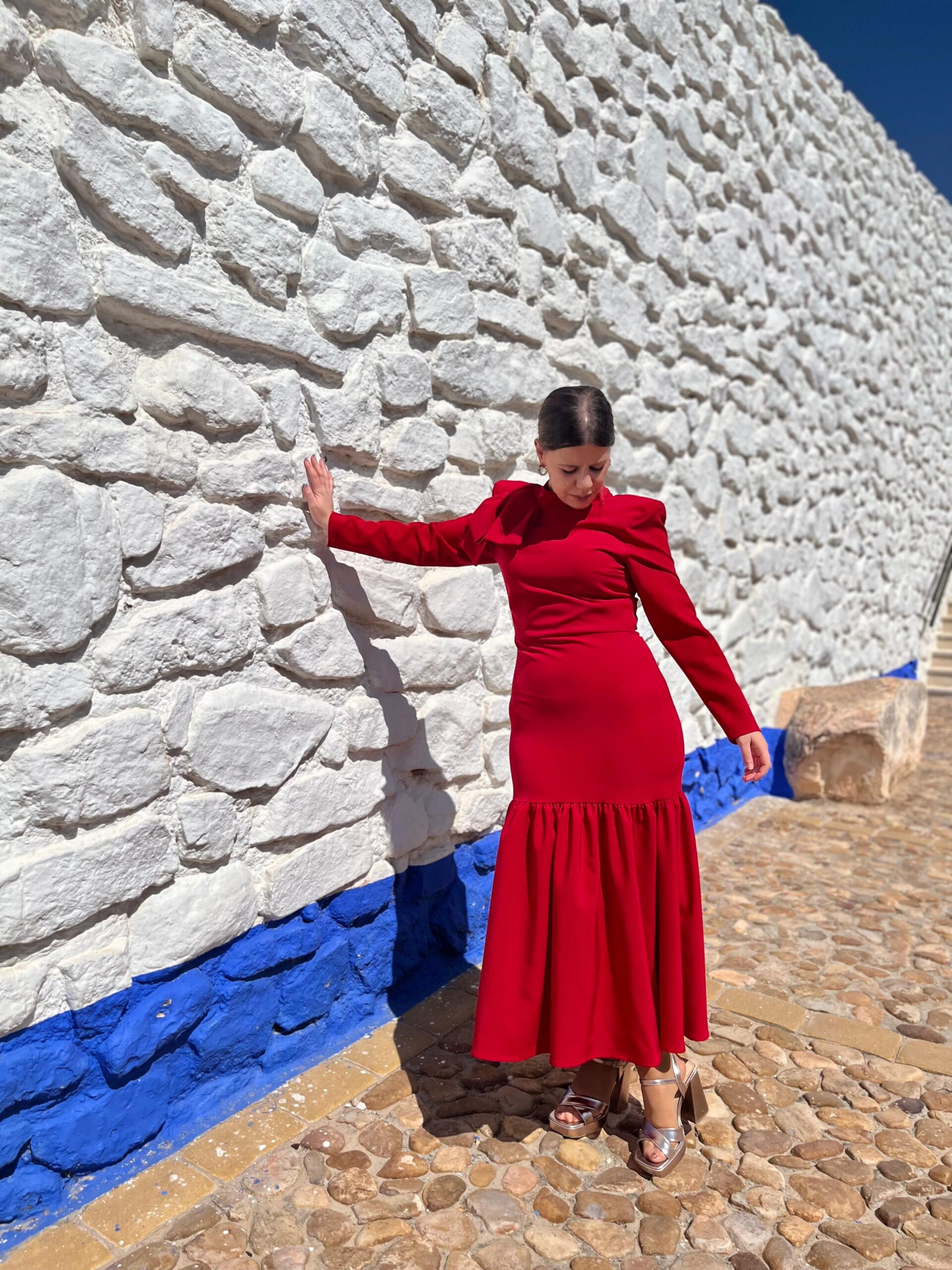 Vestido confeccionado en crepe rojo, entallado. Lazo en el hombro decorativo. Maxi hombreras. Largo midi. Maxi volante en el bajo. Manga larga entallada.
