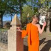 Vestido de invitada confeccionado en crepe naranja, con corte recto. Asimétrico con manga larga y lazada en el cuello. Largo midi. Vestido recomendado para boda de mañana, comunión,etc..
