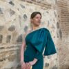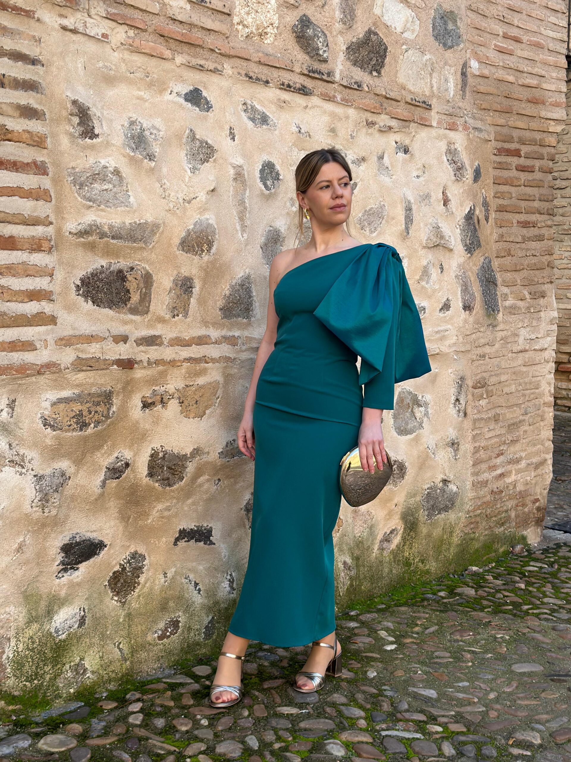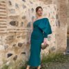 Vestido midi, ajustado, confeccionado en crepe verdoso azulado. Maxi lazo en el hombro en tafetán. Asimétrico, manga izquierda. Fabricado en España. Marca: Mariquita Trasquilá atelier ( exclusivo en nuestra tienda).
