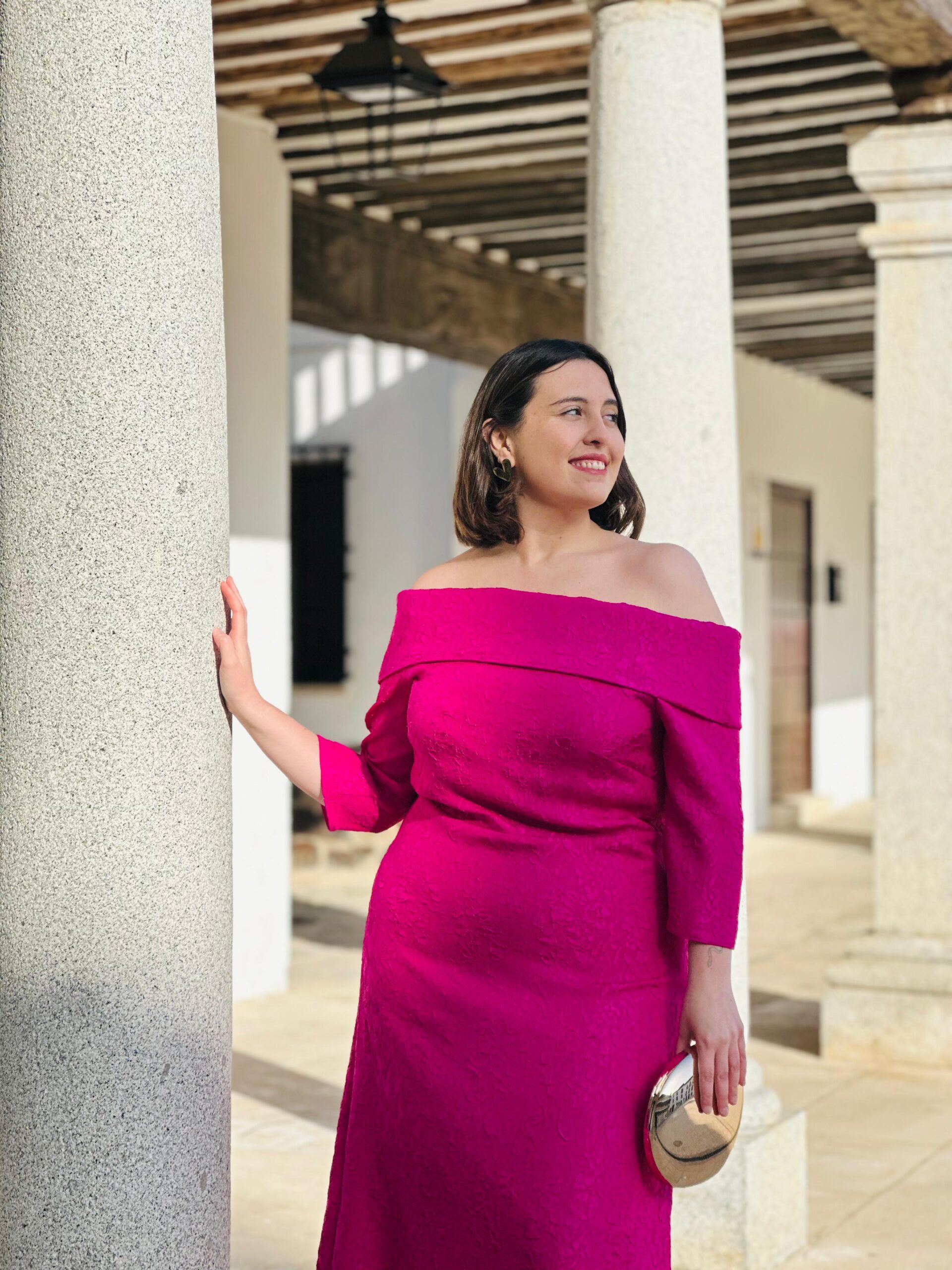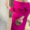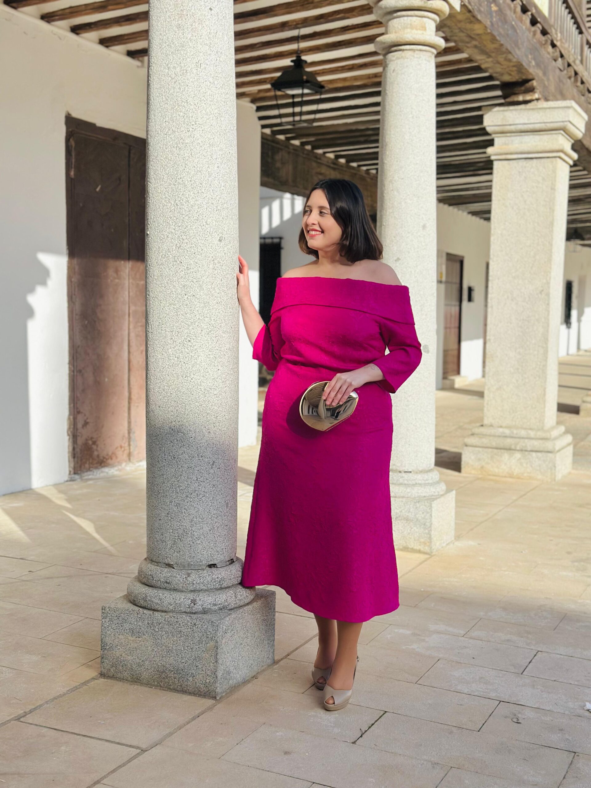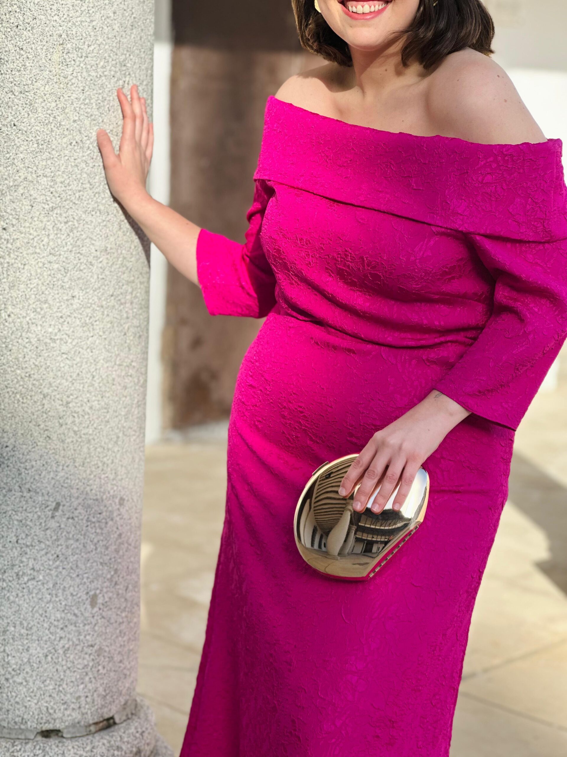 Vestido palabra de honor, tejido en jacquard. Falda evase