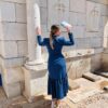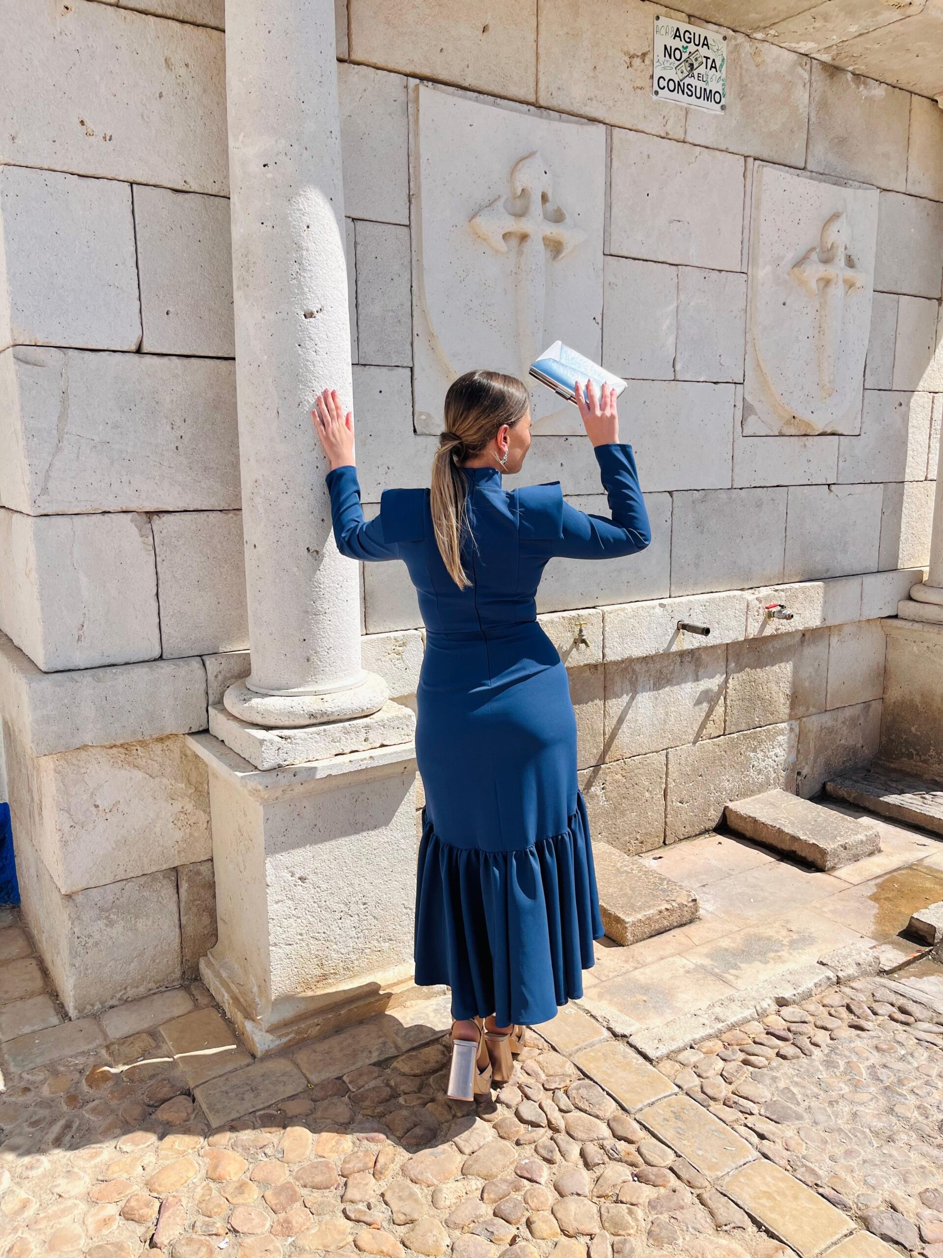 Vestido confeccionado en crepe azul real, entallado todo el cuerpo y con volumen en el bajo gracias a su maxi volante. También tenemos volumen en los hombros gracias a sus solapas en cada hombro. Con cuello. Largo midi.