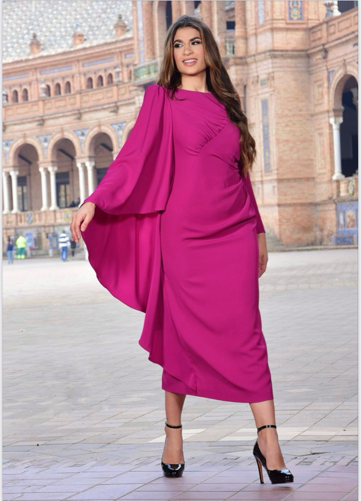 Vestido midi confeccionado en crepe elástico en color fucsia. Se adapta a tu cuerpo, resaltando tu forma, con manga larga y en manga derecha de capa. Corte en el pecho fruncido y parte de la barriga fruncida. Espalda con lágrima sutilmente abierta, cerrada con dos botones.