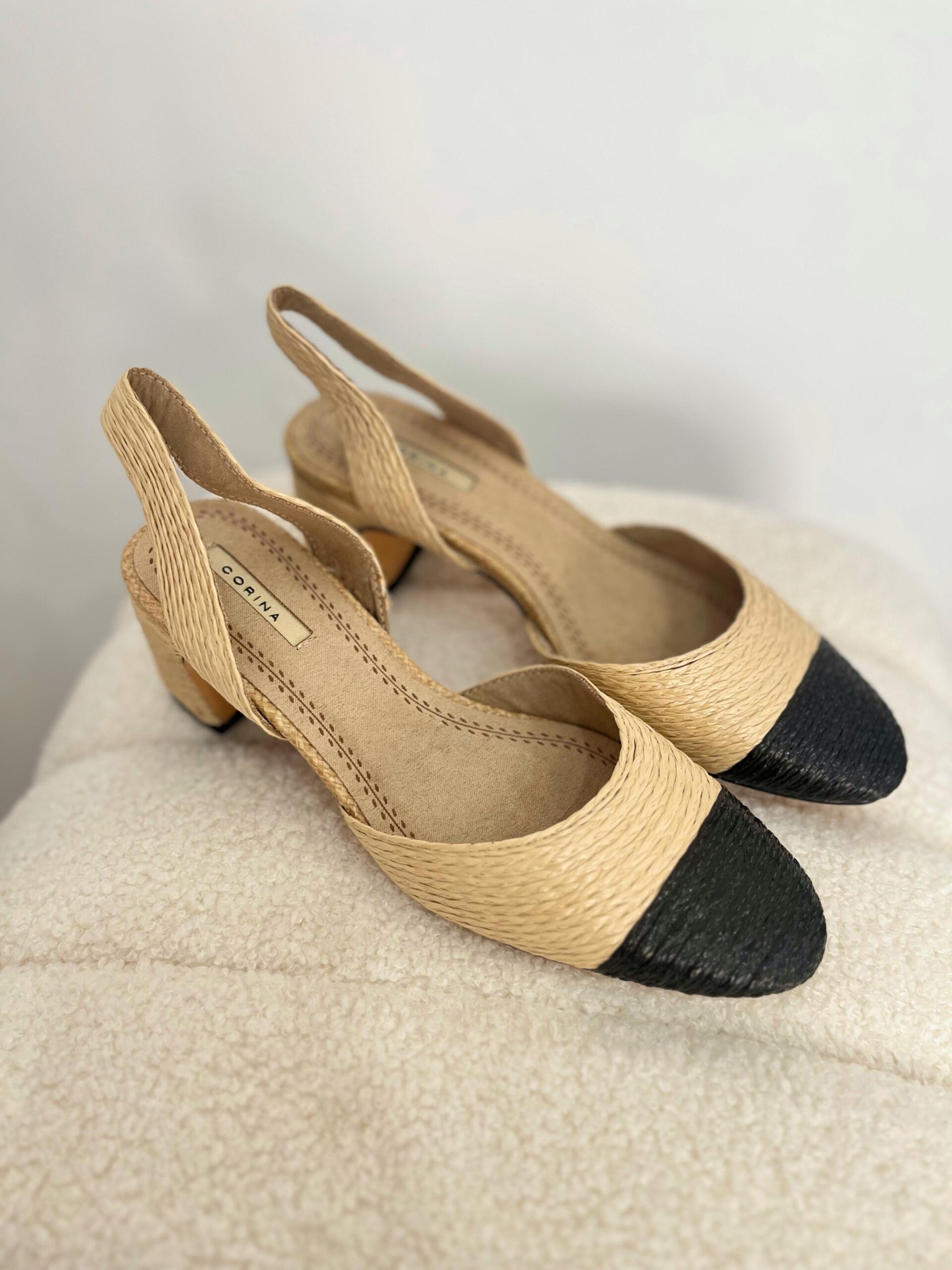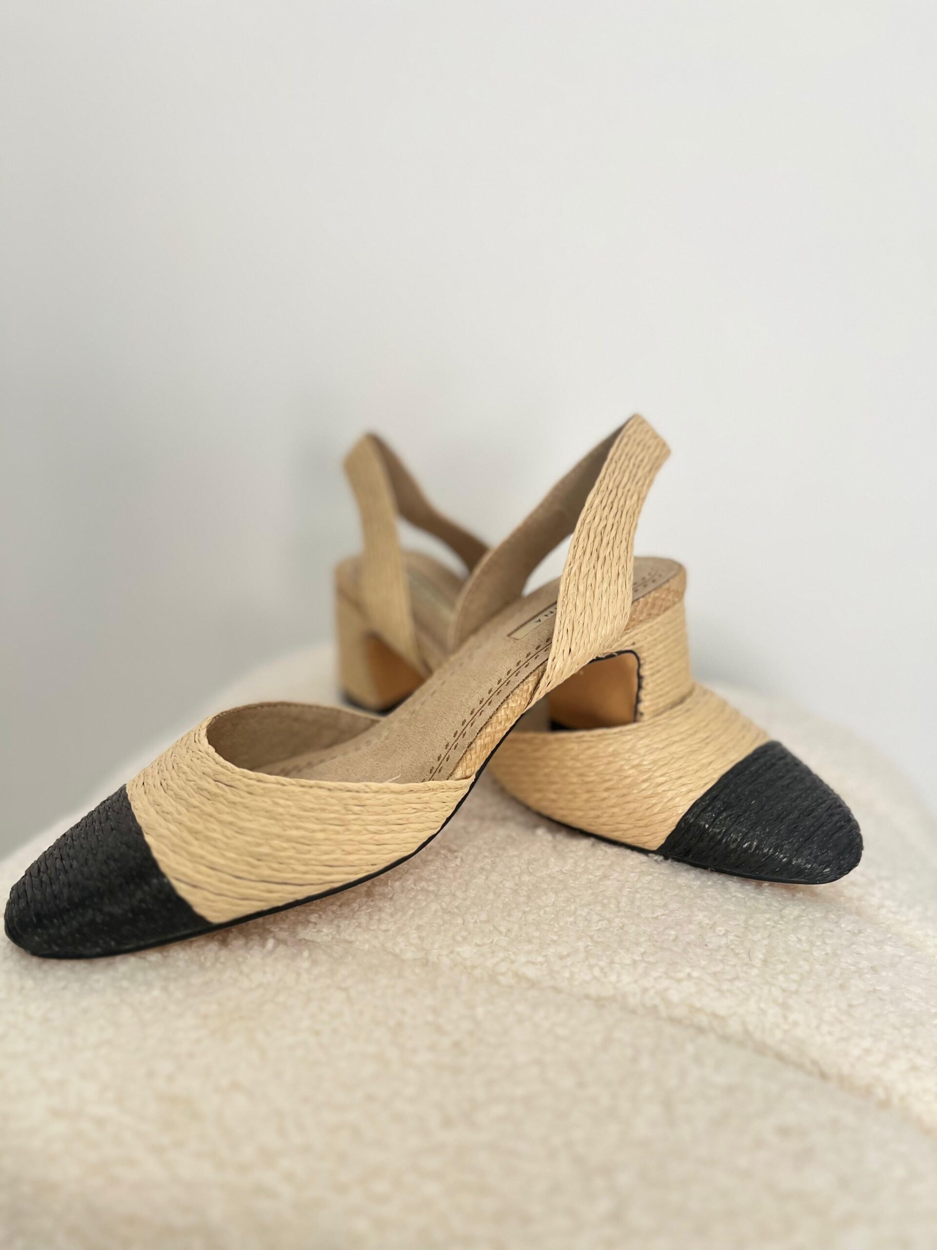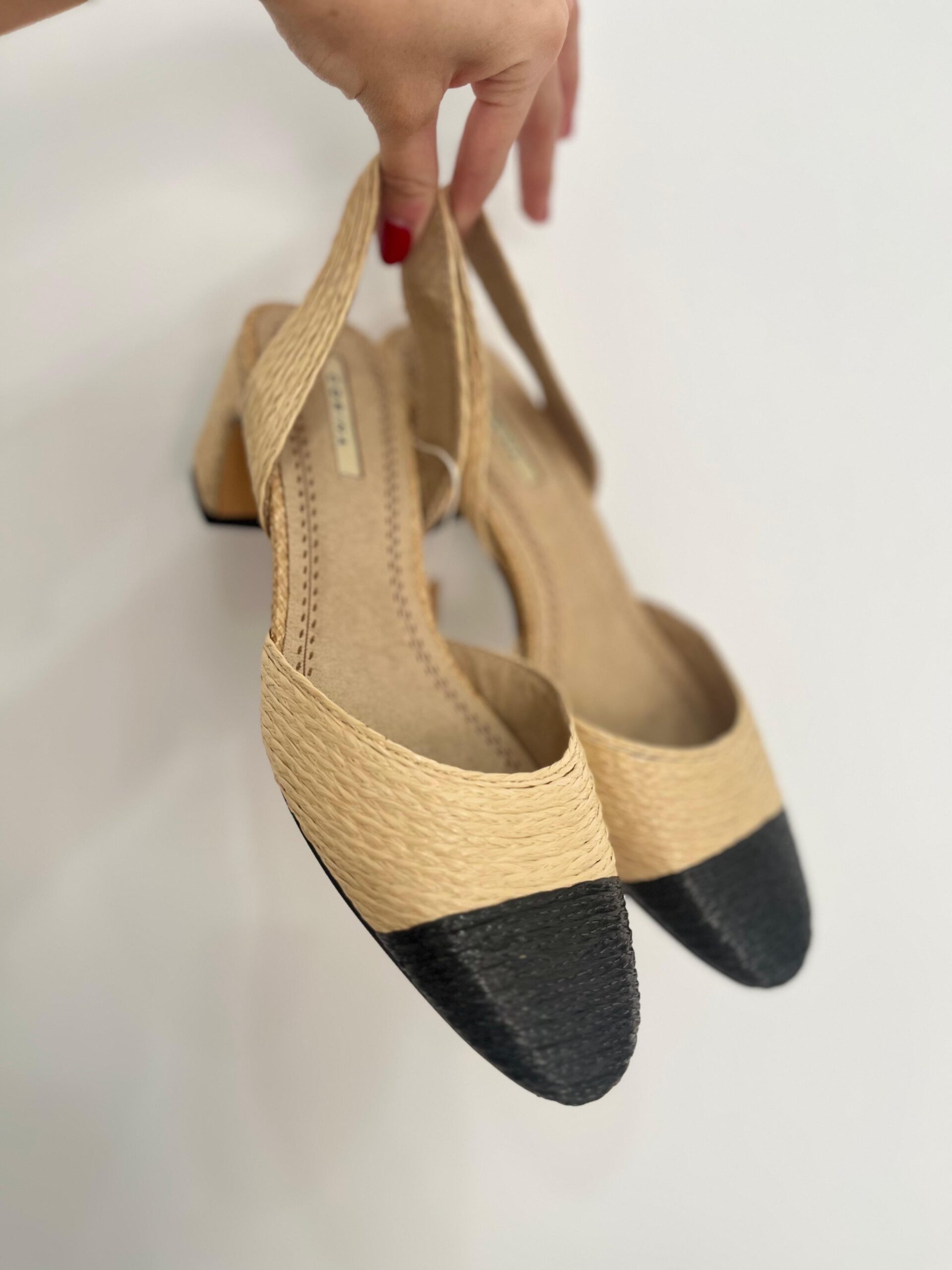 Zapato de salón, en rafia natural y negro. Ideal para eventos de primavera/verano. Se recomienda coger una talla menos.
