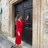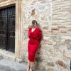 Vestido para invitada confeccionado en satén rojo. Corte recto sencillo, con solapas en el pecho. Escote a pico poco pronunciado. Manga larga ajustada. Falda recta con abertura trasera. Largo midi. Vestido recomendado para invita de día y para invitada de otoño/ invierno combinándolo con una estola de pelo.