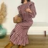 Vestido largo de cuadros, de algodón. Manga larga, con volante en los puños. Volante en el bajo. Cintura de panal de abeja. Talla única.