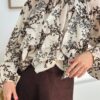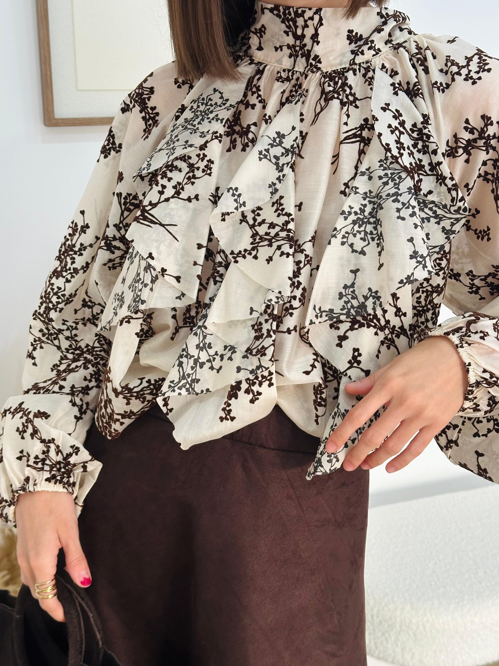 Blusa de algodón, con estampado de ramas. Cuello alto, lazo en la espalda y chorreras en delantero. Manga abullonada. Forma evasé ( más ancha abajo).Talla única.