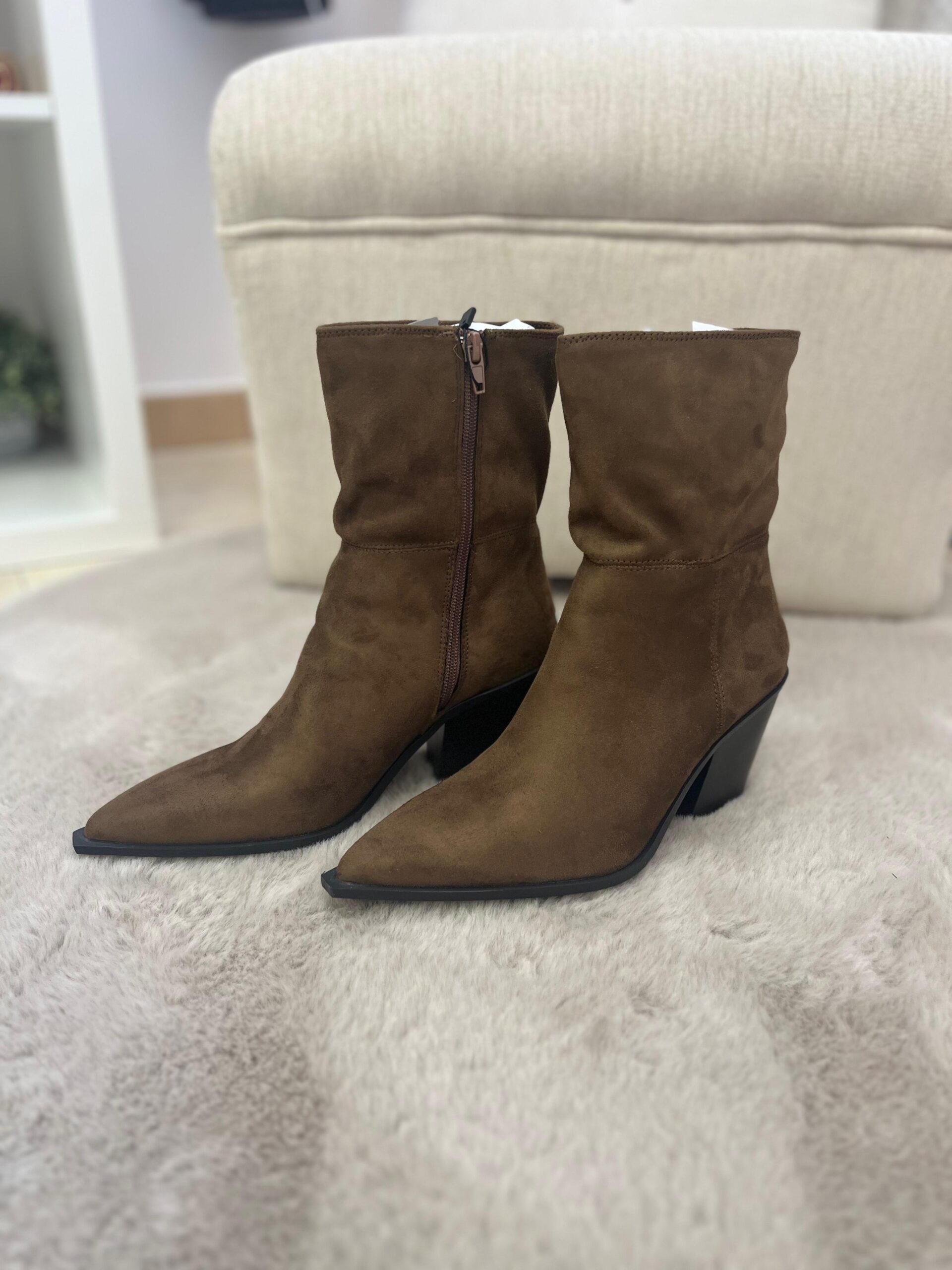 Botín de tacón de 4m, en ante marrón. En punta, tipo cowboy.