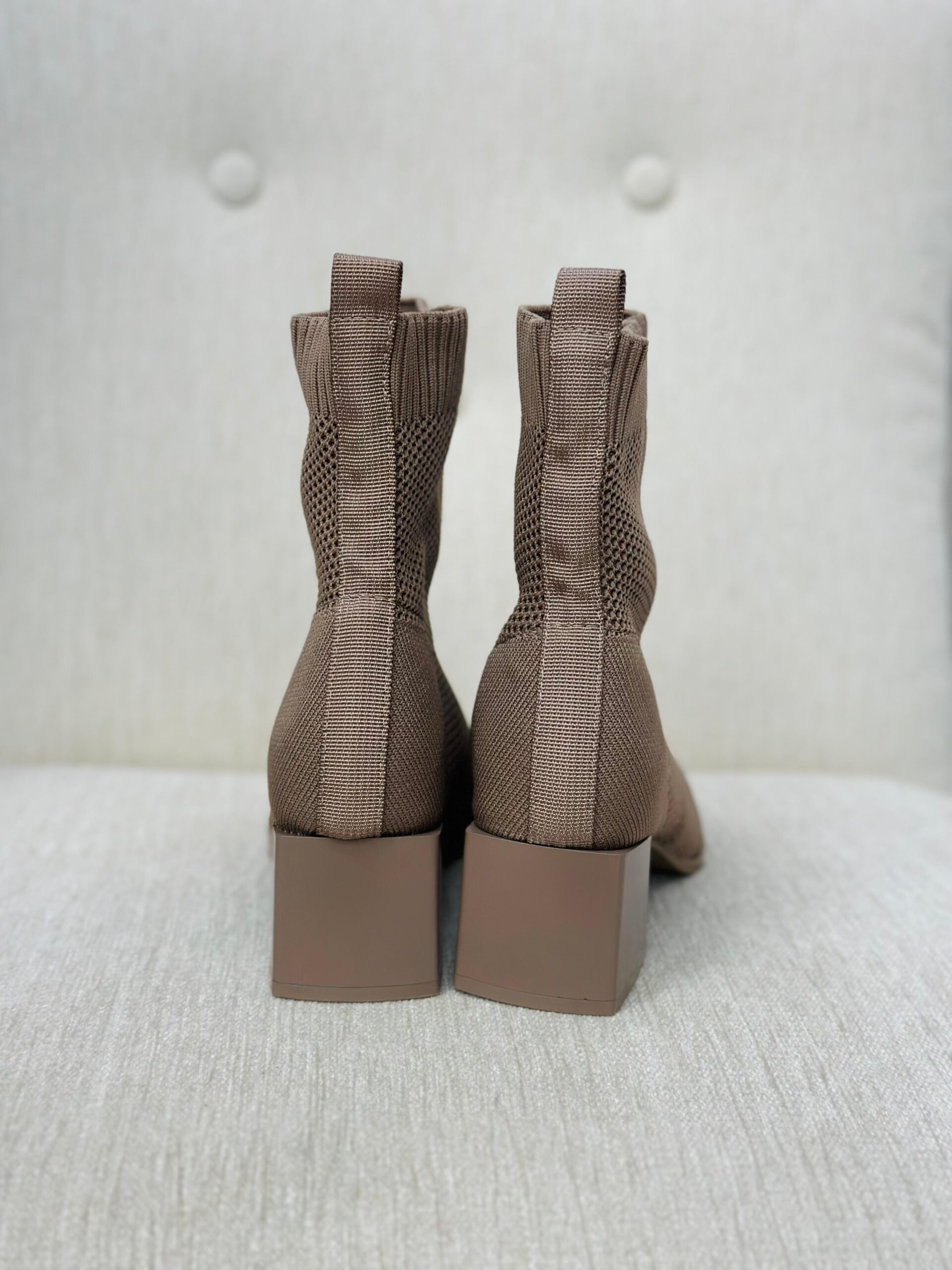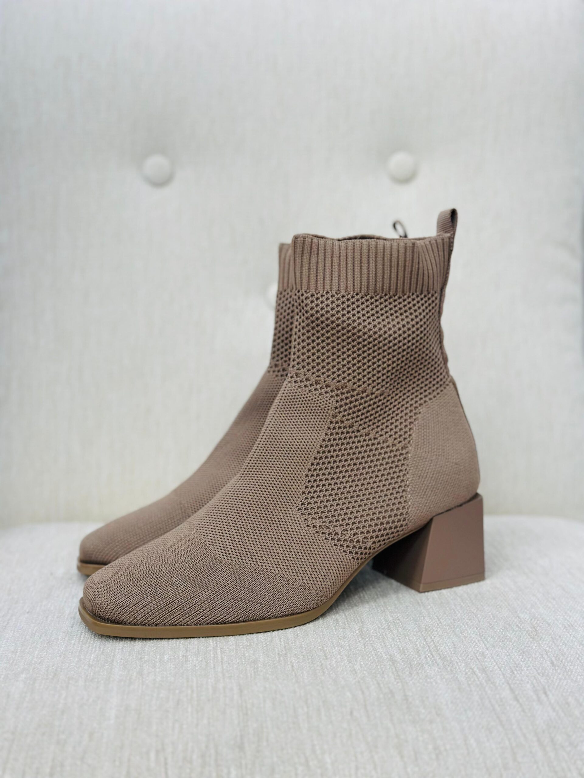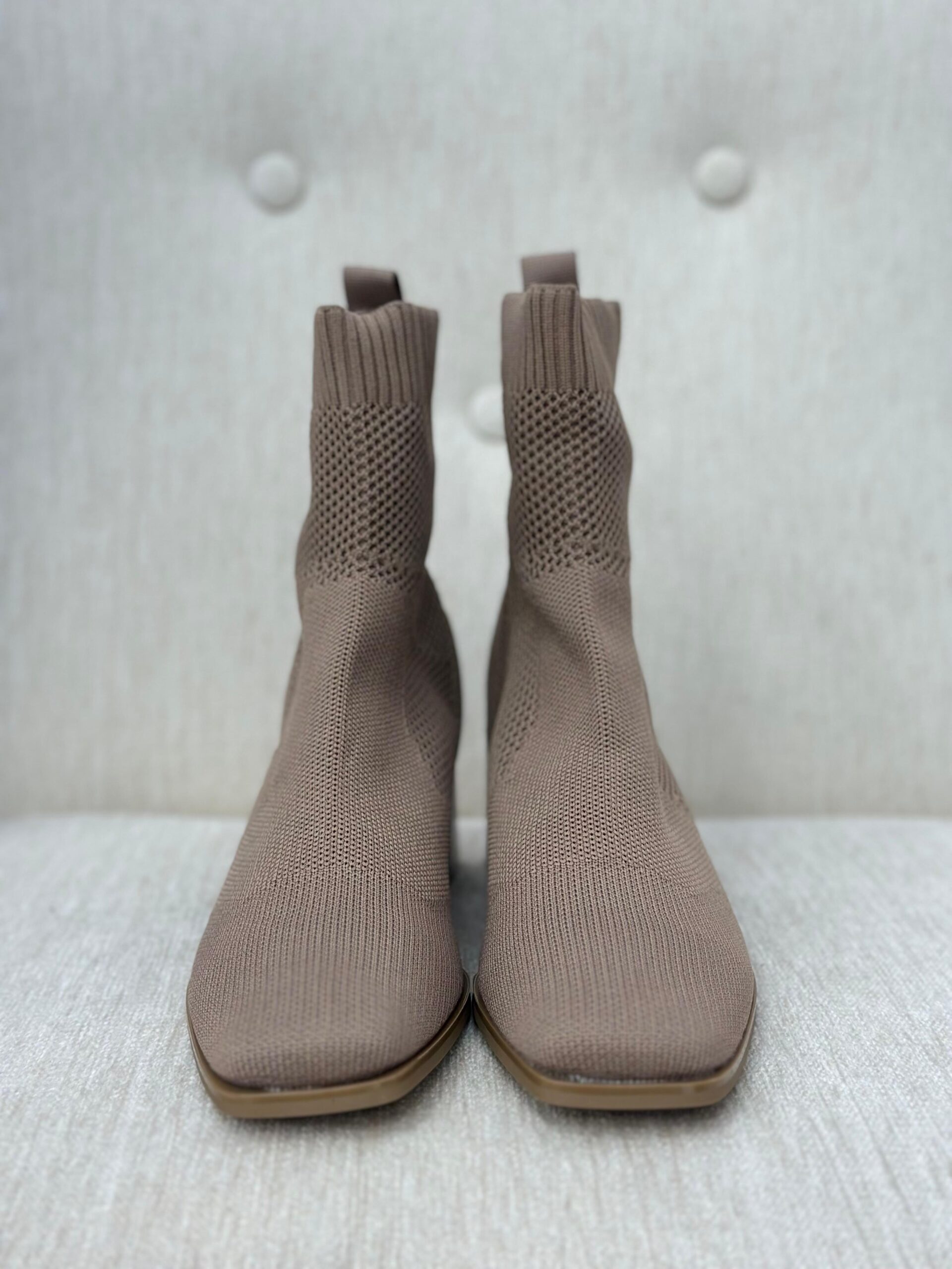 Botín tipo calcetín, color beige. con tacón de 4cm. Se ajustan al pie.