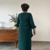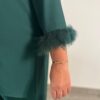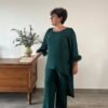 Conjunto de invitada de casaca y pantalón en color verde oscuro. Manga tres cuartos con plumas. Casaca larga por detrás. Conjunto recomendado para invitadas tanto de tarde como de mañana, también recomendado para otro tipo de eventos como cenas formales.