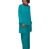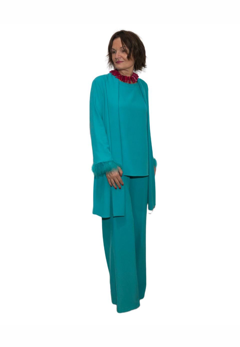 Conjunto tres piezas confeccionado en crepe azul/verdoso. Casaca de manga larga con plumas en los puños. Top de tirante ancho, corte ancho, suelto y larguito. Pantalón recto sencillo con goma en la cintura.