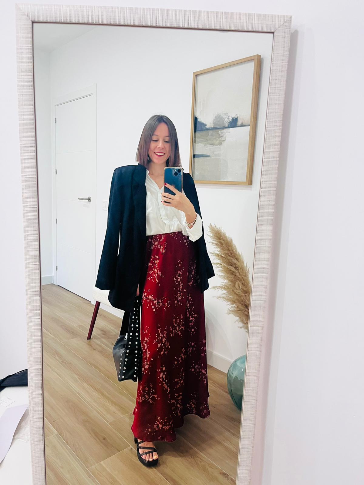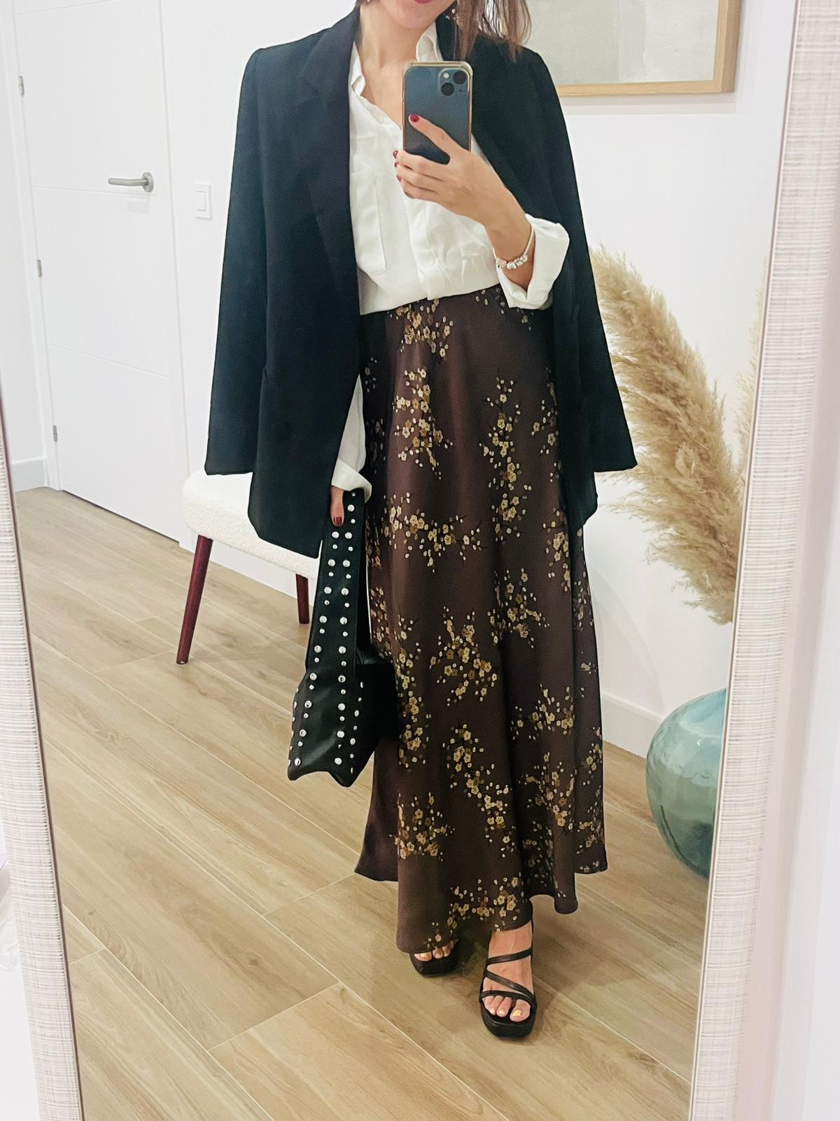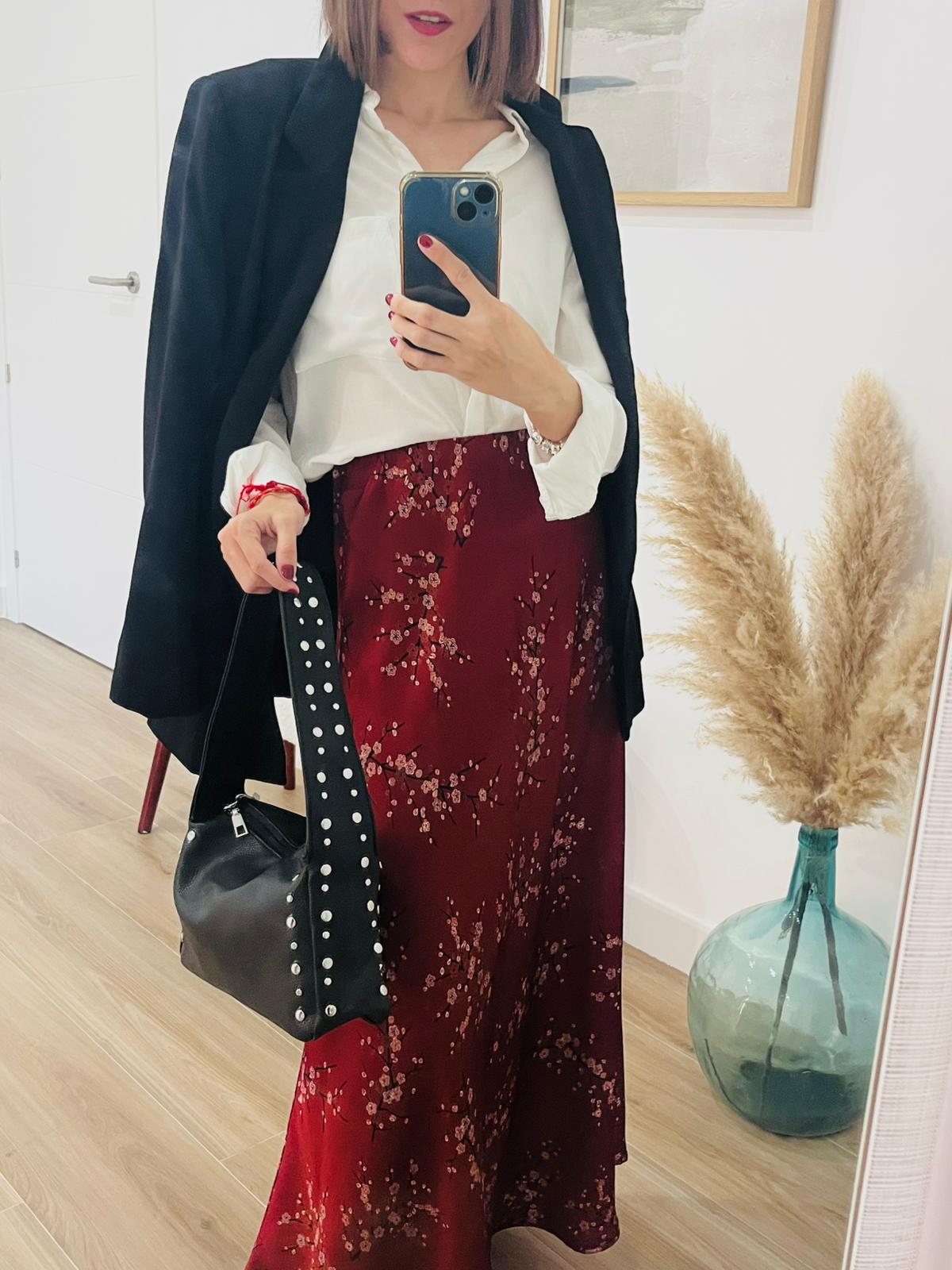 Falda satinada midi. Con goma en la cintura. Cortada al bies. Corte evasé. Talla única.