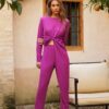Mono confeccionado en crepe color very peri. Manga larga. Nudo en la barriga que da lugar a una abertura y a una sobrecapa en la pierna izquierda. Pantalón recto sencillo.