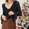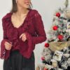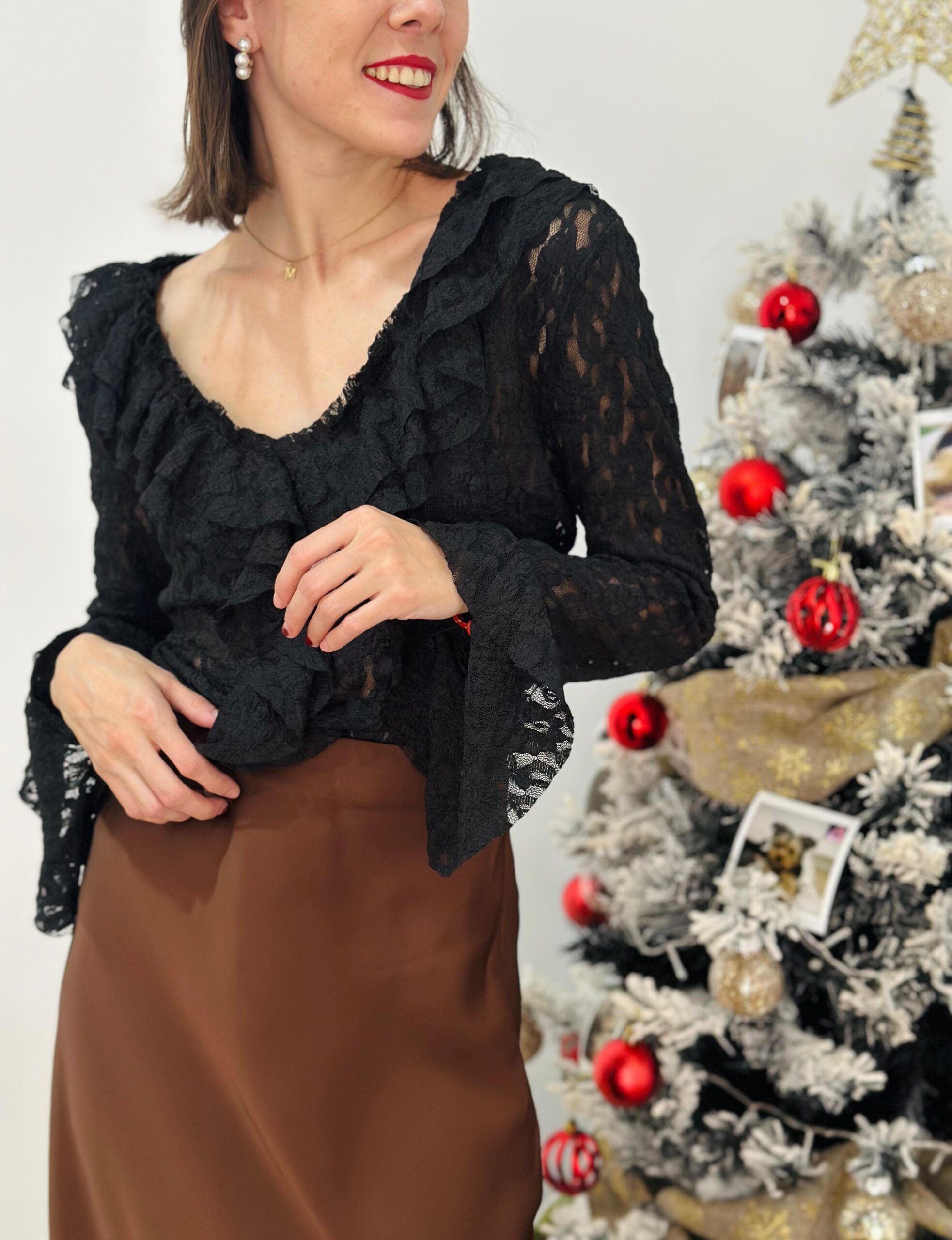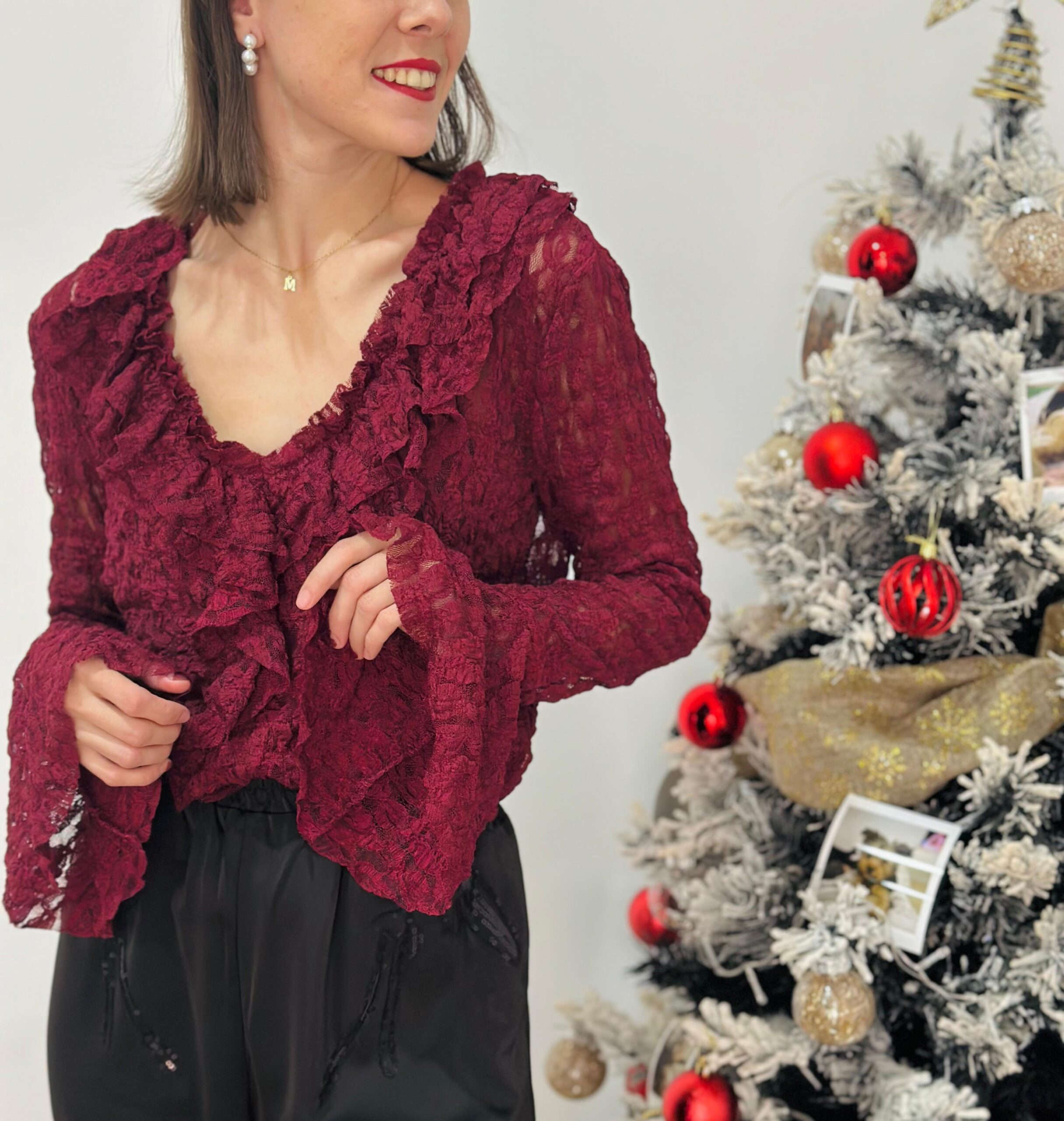 Top de blonda, transparente (poco). En dos colores, negro y burdeos. Entallado. Escote en V, con volantes en escote y puños. Elástico. Talla única.