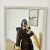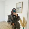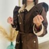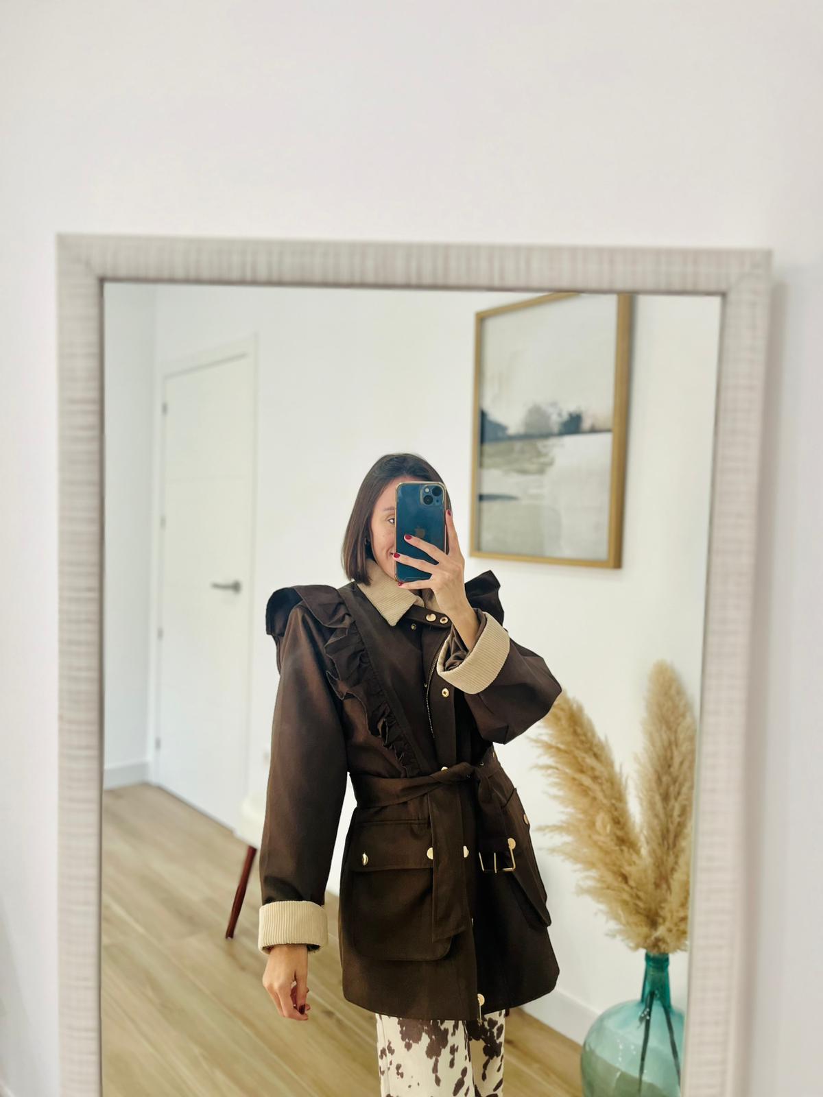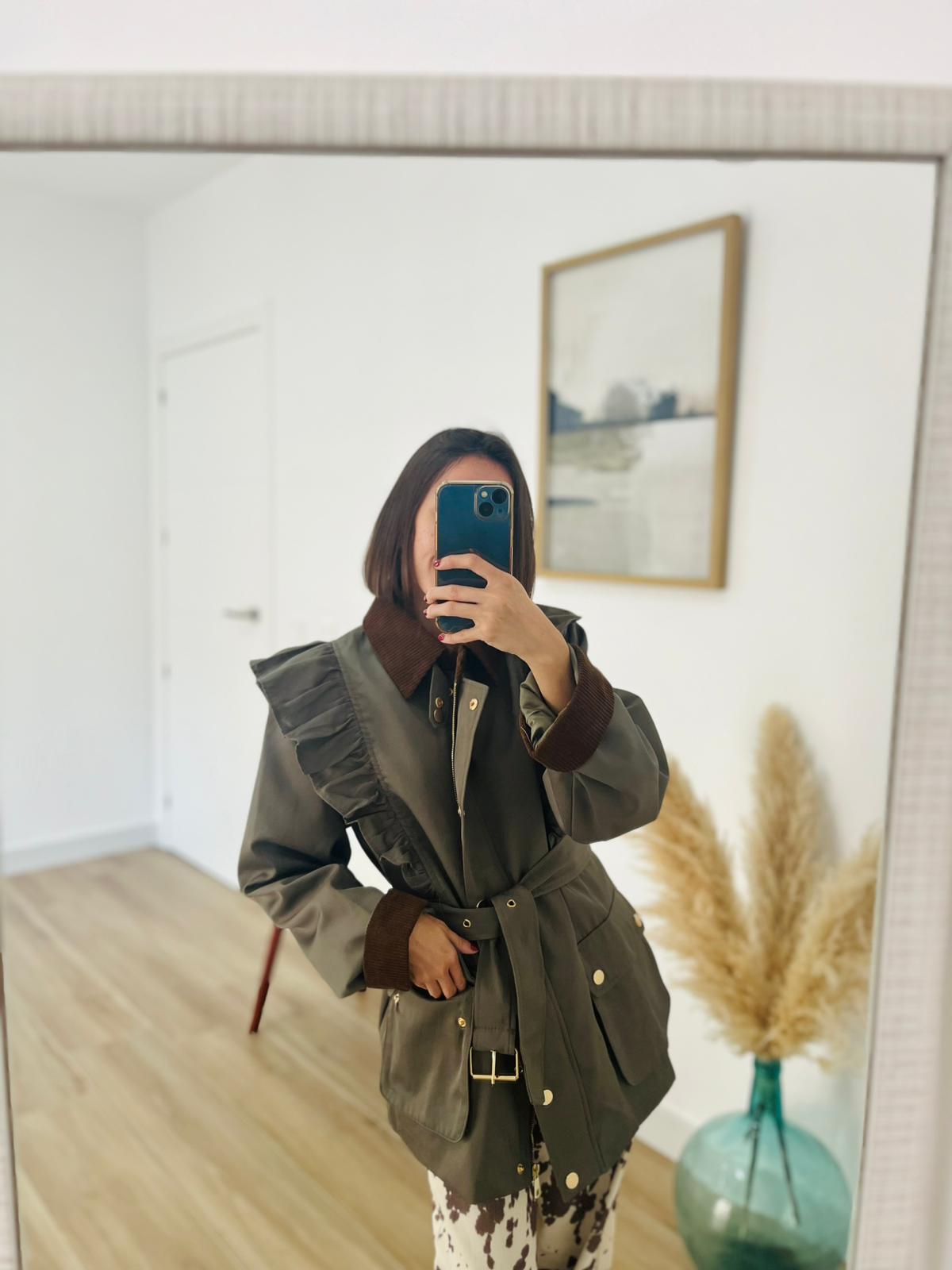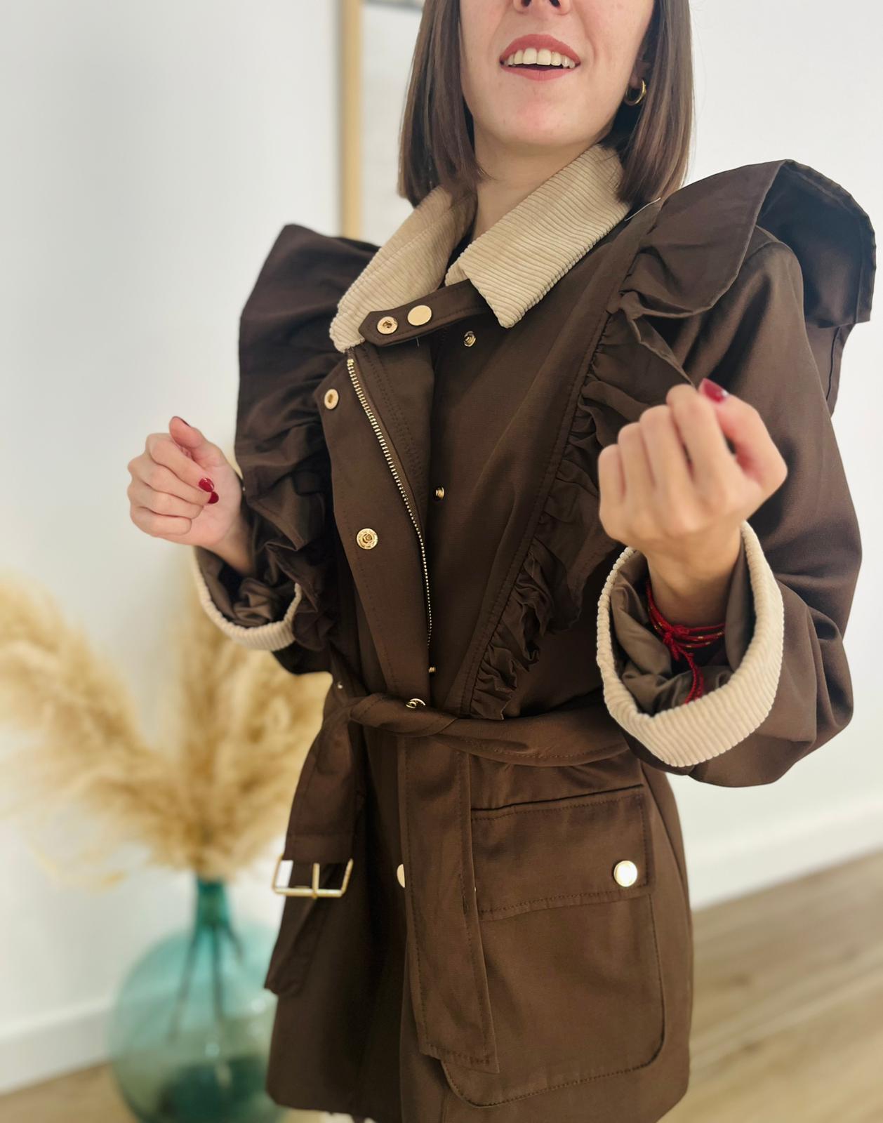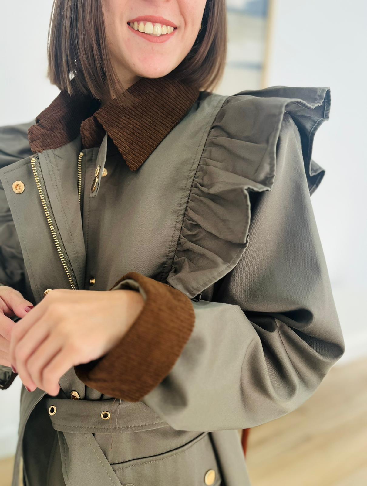 Trench guateada, forrada e impermeable. Corte recto, con volantes en delantero y espalda. Contrate de pana en cuello y puños. Incluye cinturón.