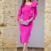 Vestido midi confeccionado en crepe elástico fucsia. El vestido Carmen se adaptará a tu silueta perfectamente. Su escote es asimétrico, con su gran volante en el hombro izquierdo. Barriga drapeada. Manga 3/4. Cierre en la espalda con cremallera.