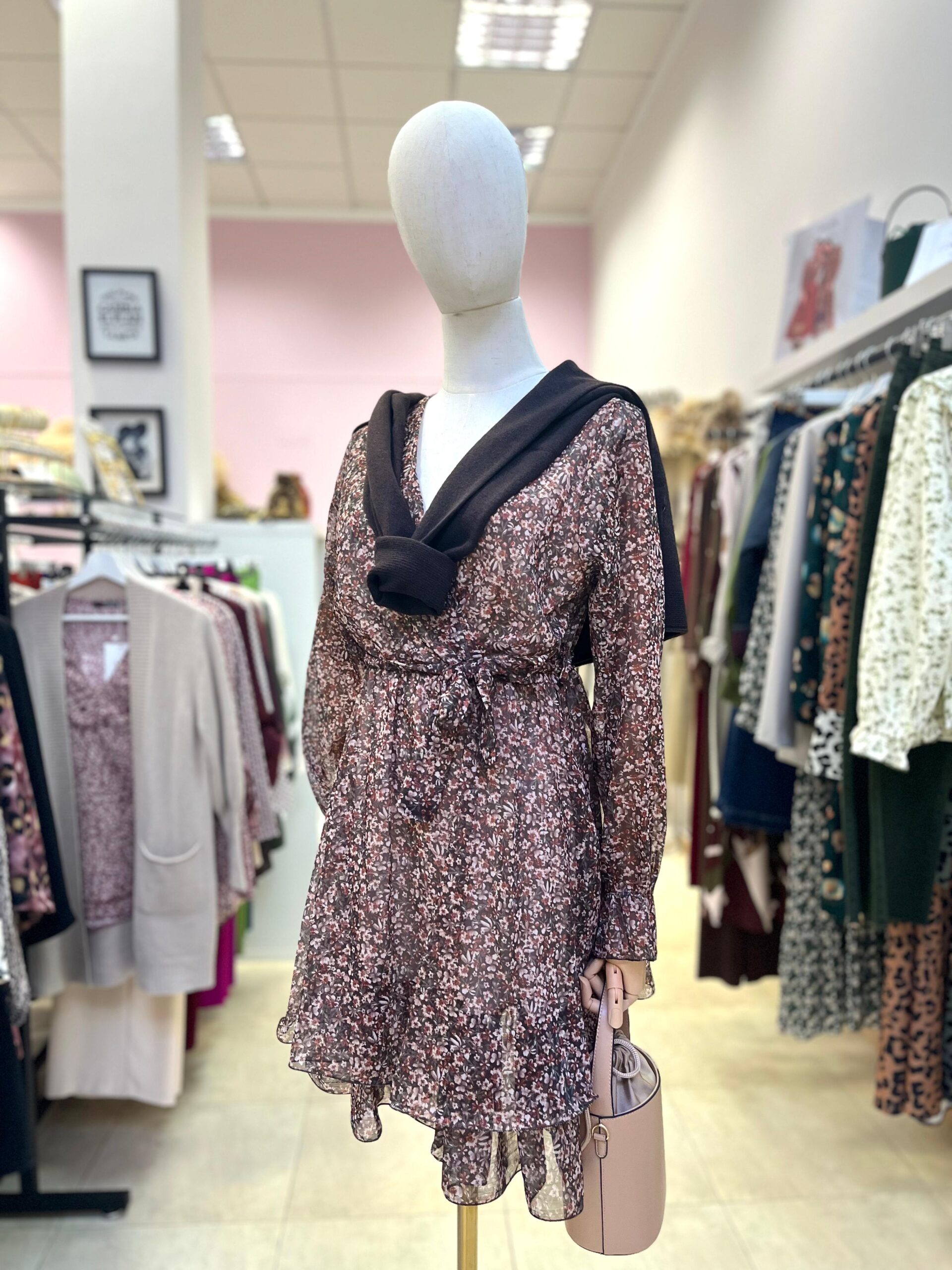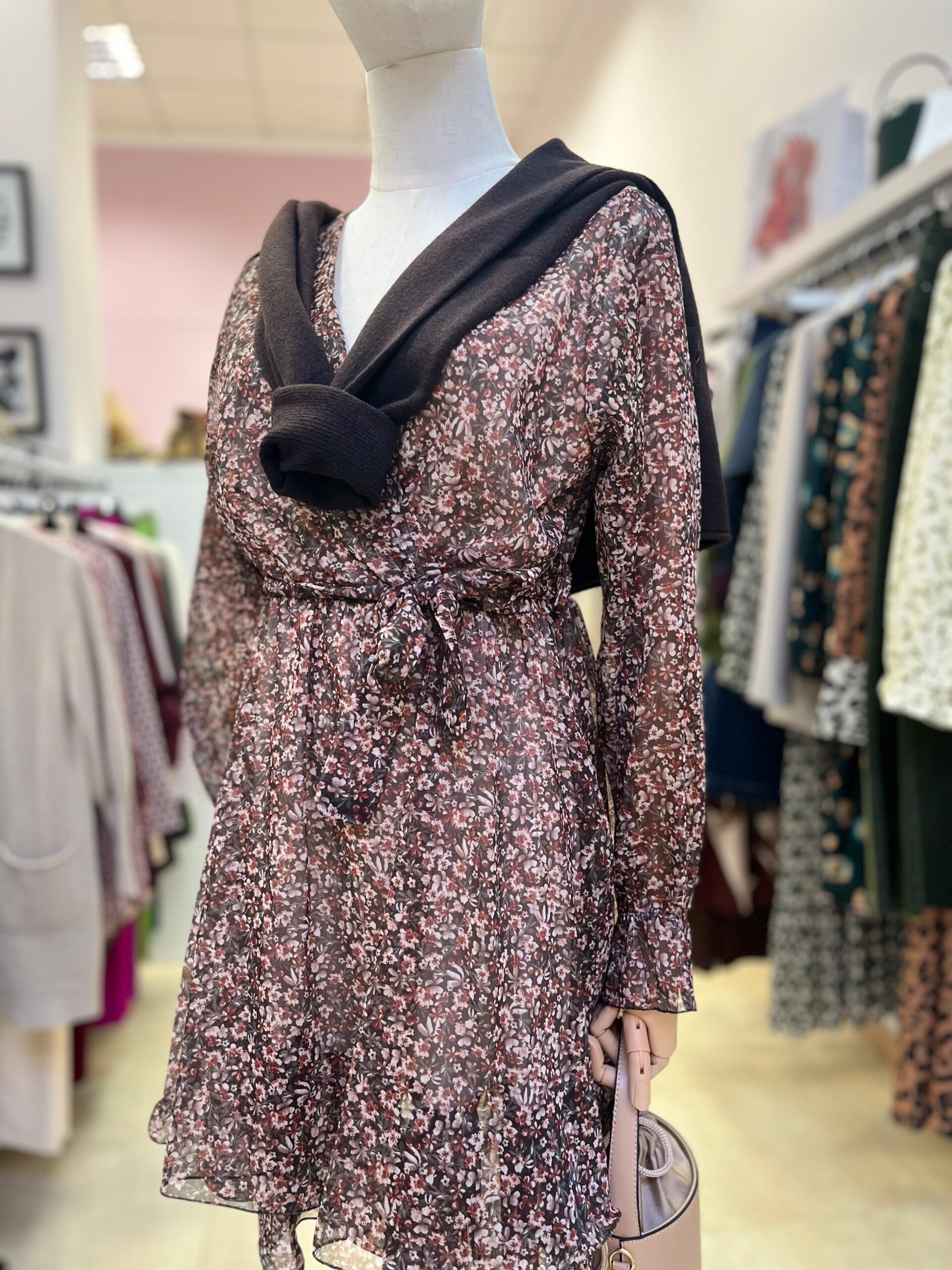 Vestido corto de gasa, forrado. Manga larga. Escote cruzado. Goma en la cintura. Talla única.