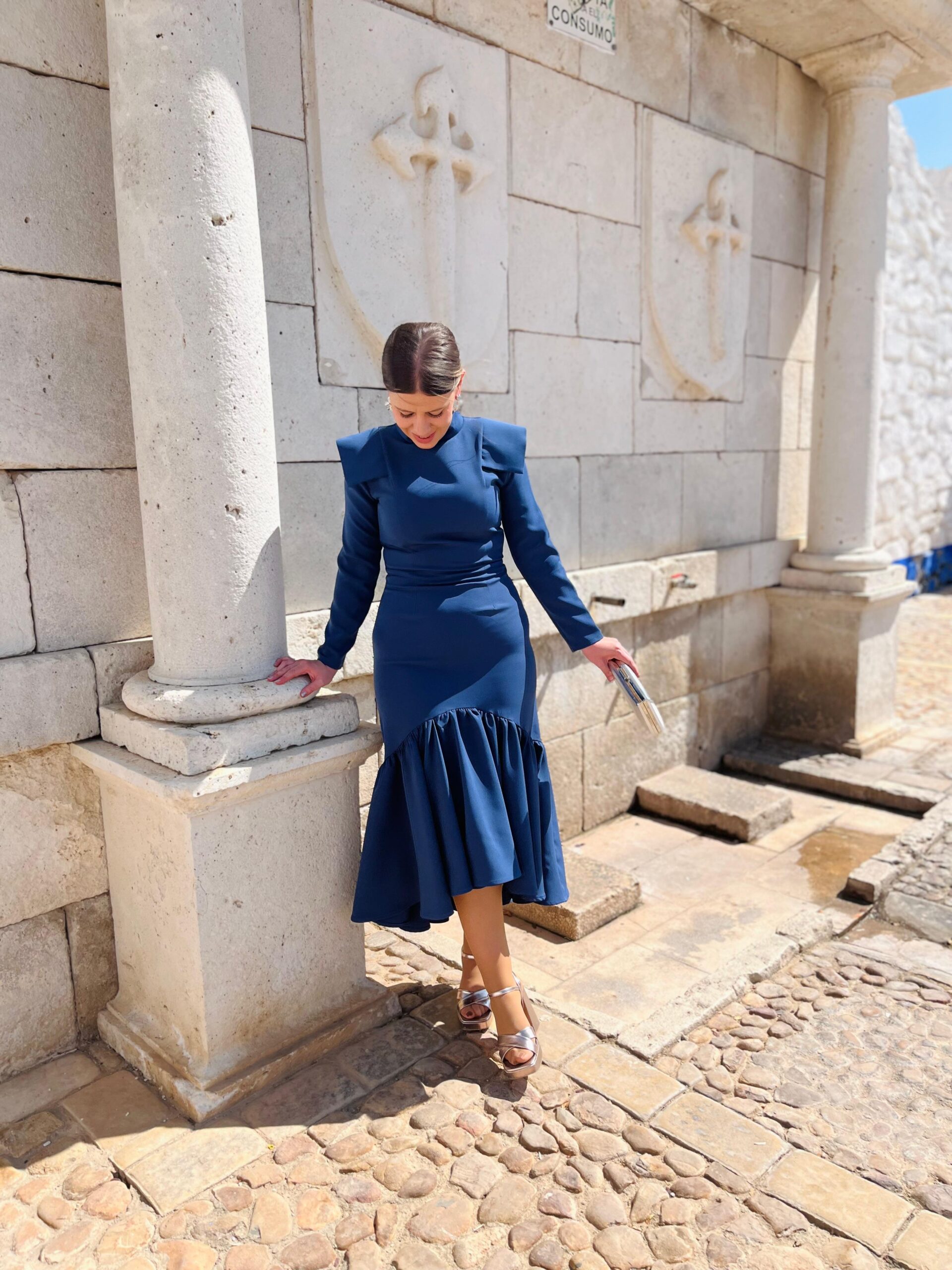 Vestido confeccionado en crepe azul real, entallado todo el cuerpo y con volumen en el bajo gracias a su maxi volante. También tenemos volumen en los hombros gracias a sus solapas en cada hombro. Con cuello. Largo midi.